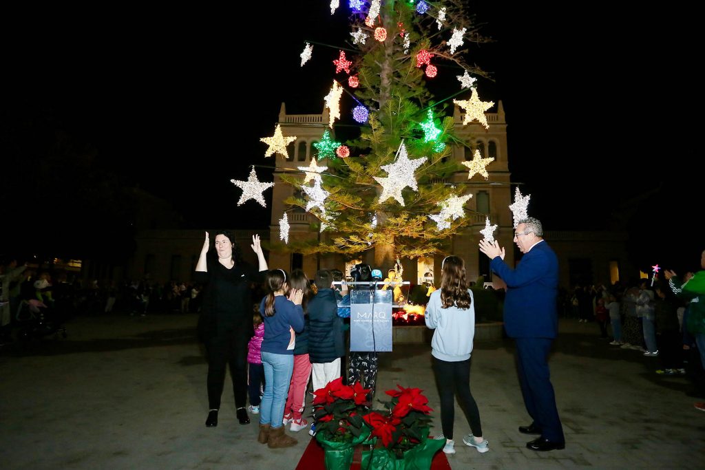 El encendido del Árbol de Navidad del Museo Arqueológico de Alicante (MARQ) ha dado inicio al calendario navideño que ofrecerá interesantes actividades para disfrutar de la cultura en familia durante las próximas vacaciones escolares. El presidente de la Diputación, Toni Pérez, ha asistido esta tarde a este entrañable y tradicional acto que todos los años reúne en los jardines del Museo a los más pequeños de la casa.