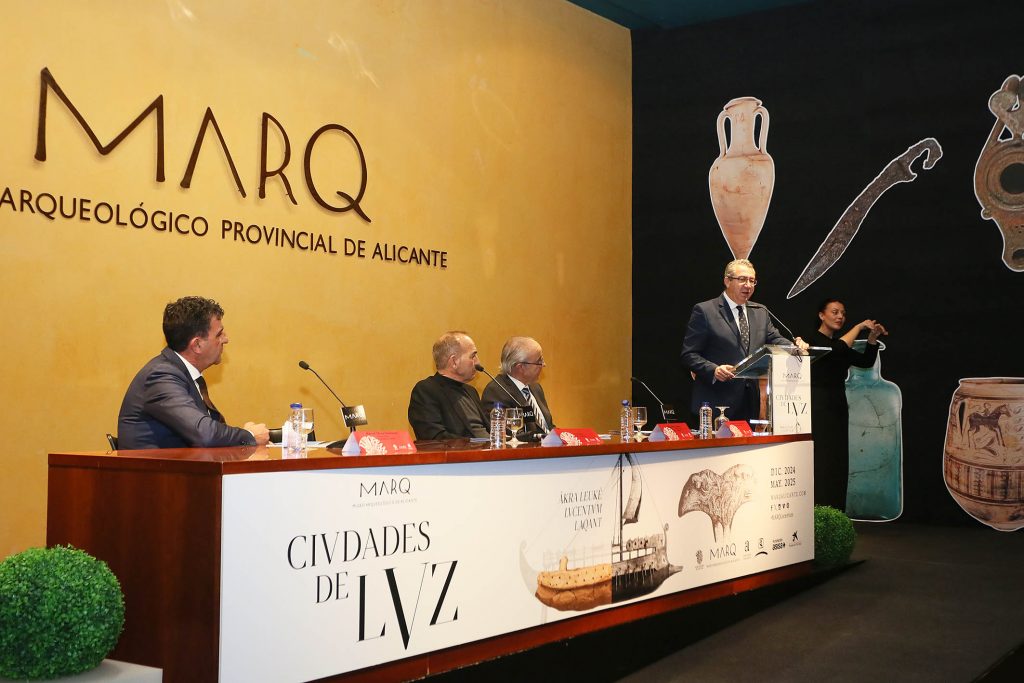 El director del MARQ y comisario de la exposición, Manuel Olcina, ha intervenido junto al presidente en este evento en el que también han participado como comisarios el director del Área de Arquitectura de la Diputación, Rafael Pérez, y los técnicos de Excavaciones de la Fundación C.V. MARQ, Antonio Guilabert y Eva Tendero, además del arquitecto Ángel Rocamora, encargado de diseñar el espacio expositivo. El director gerente de la Fundación C.V. MARQ, José Alberto Cortés, ha sido el encargado de moderar el acto.