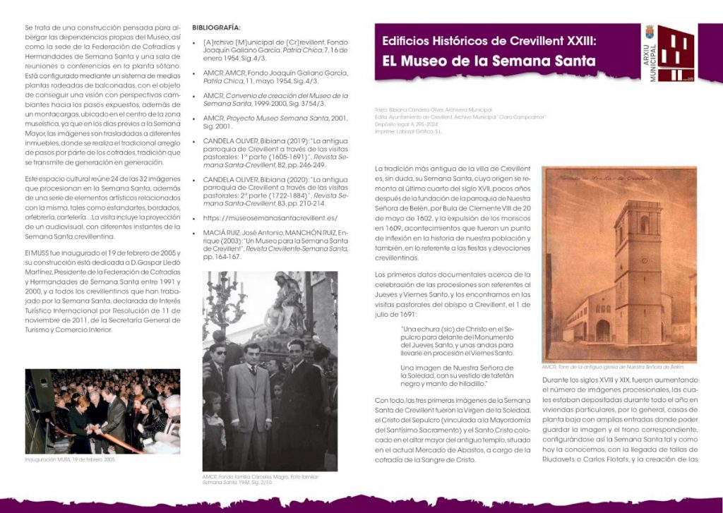 El Archivo Municipal Clara Campoamor publica un nuevo ejemplar de la serie dedicada a los Edificios Históricos de Crevillent, en su número vigésimo tercero, en esta ocasión, dedicado al Museo de la Semana Santa, nuestra tradición más antigua cuyo origen se remonta al último cuarto del siglo XVII y que se configura tal y como hoy la conocemos en el Diecinueve.