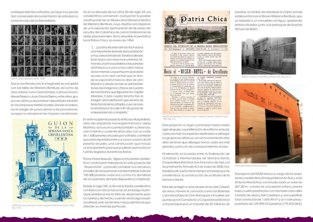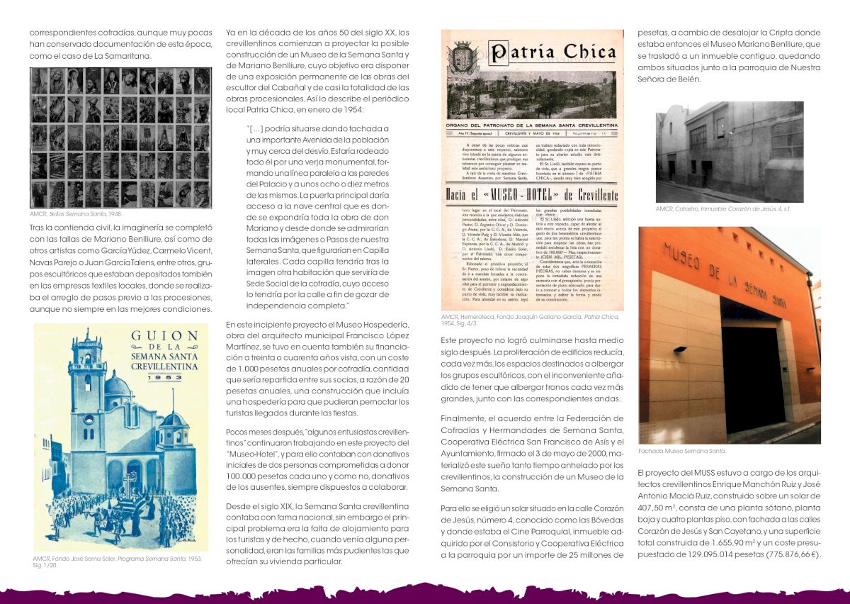La archivera municipal Bibiana Candela Oliver apunta que “tras las últimas adquisiciones de grupos escultóricos en la década de los cincuenta del pasado siglo XX, los cuales permanecían depositados en casas particulares o fábricas locales, los crevillentinos comienzan a proyectar la construcción de un Museo de la Semana Santa y de Mariano Benlliure, con el objetivo de disponer de una exposición permanente de estas obras, además de ser hospedería, dado que la Semana Santa crevillentina ya contaba con fama nacional desde el siglo XIX, pero el principal problema era la falta de alojamiento para los turistas”.