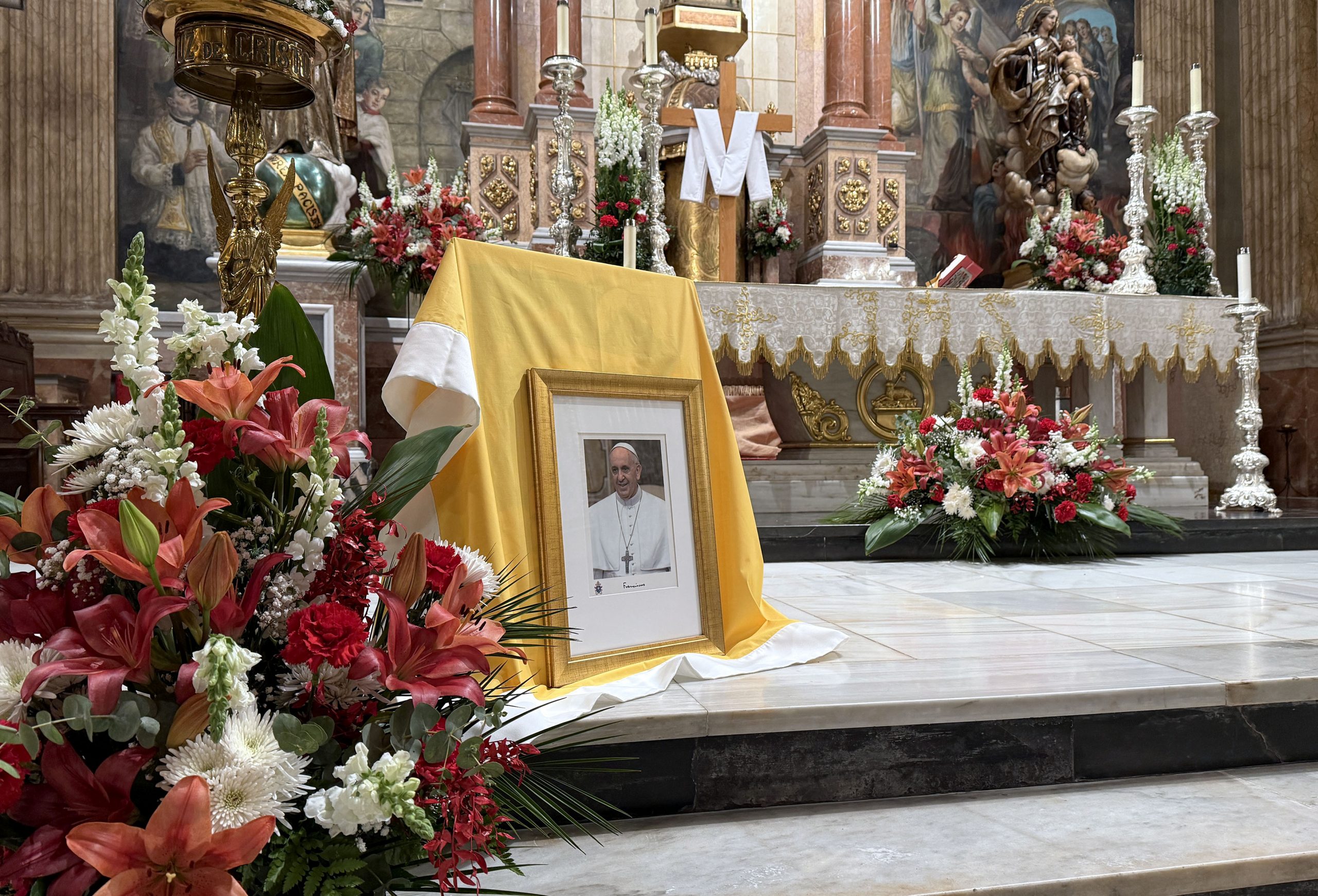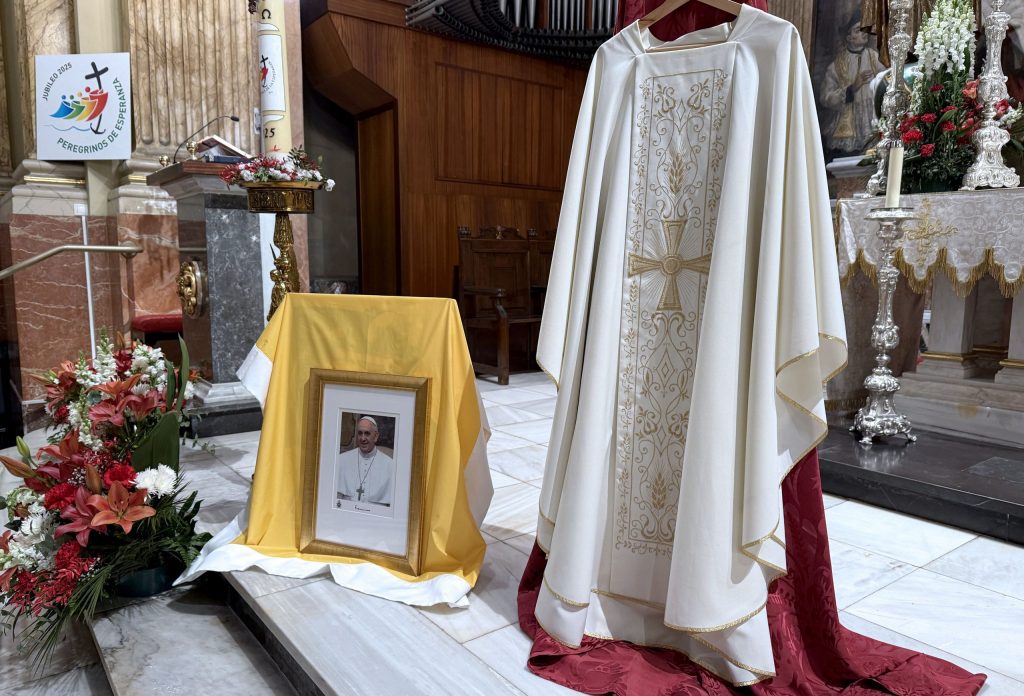 El templo, al igual que el resto de parroquias de la archidiócesis, acoge desde el pasado lunes el rezo del Rosario por el Papa Francisco, cuya foto preside el altar, en un cuadro adornado con una de las balconeras con los colores blanco y amarillo del Vaticano, que el templo conserva desde el Encuentro Mundial de las Familias.