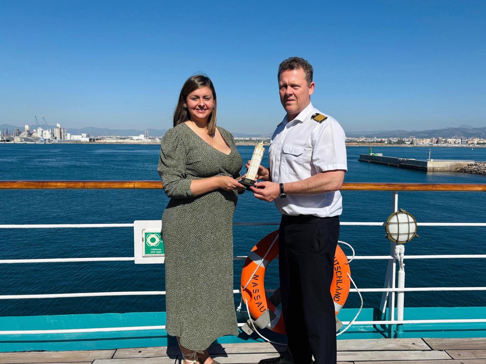 La concejal de Turismo, Arantxa Miralles, ha asistido a la recepción oficial del capitán del crucero, a quien ha dado la bienvenida en nombre de la ciudad y le ha entregado como obsequio institucional una figura cerámica del Fadrí, símbolo patrimonial de Castellón.