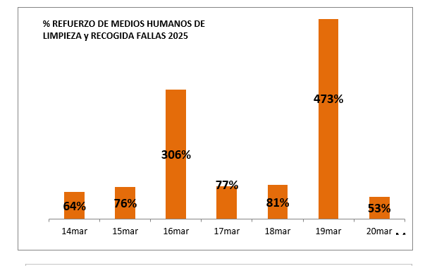 Todos estos refuerzos corresponden al plan especial que el Ayuntamiento ha implementado para las celebraciones de Fallas desde el día 1, con el inicio del calendario de mascletaes. De hecho, para la limpieza posterior a la mascletà de cada día en la plaza del Ayuntamiento se ha hecho uso de 18 barredoras mecánicas y un recolector de carga trasera, atendidos por un conjunto de 32 operarios y dos encargados de organización. El dispositivo ha contado cada día con el apoyo de la Policía Local para que la afluencia de ciudadanos no impidiera la circulación de la maquinaria.