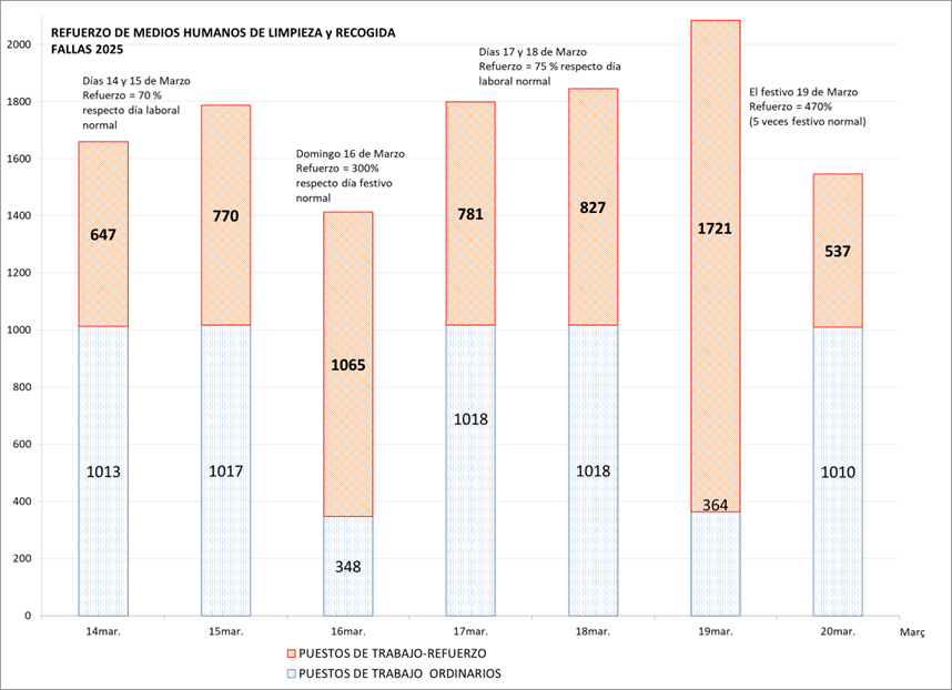 - Durante el 19 de marzo habrá un total de 2.085 personas en las calles, en labores de limpieza y recogida, es decir 1.721 más que un festivo normal