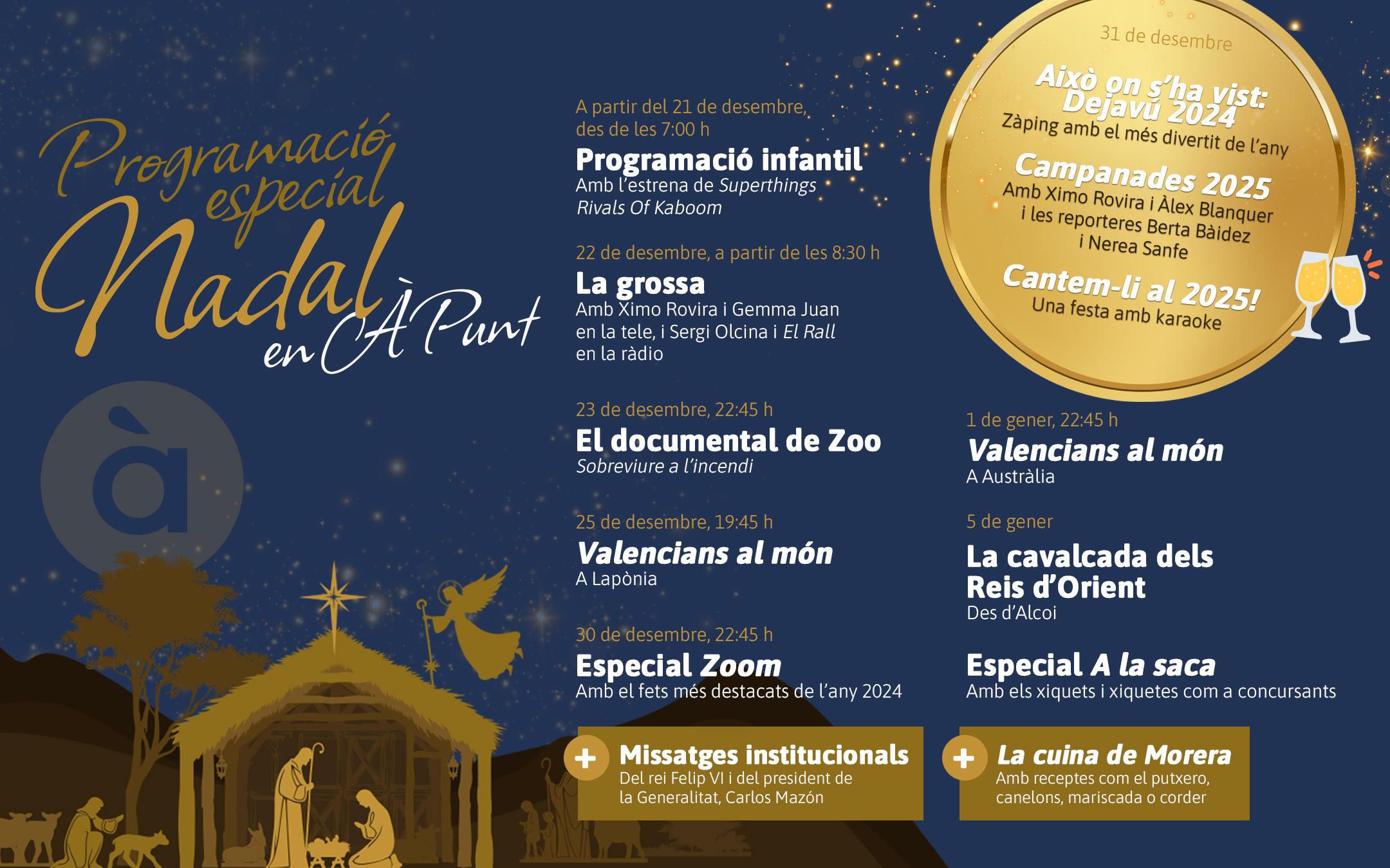 El dimarts 24 de desembre, a les 21:00 hores, la radiotelevisió valenciana emet el missatge de Nadal del rei Felip VI. À Punt també retransmetrà el tradicional missatge institucional del president de la Generalitat, Carlos Mazón.