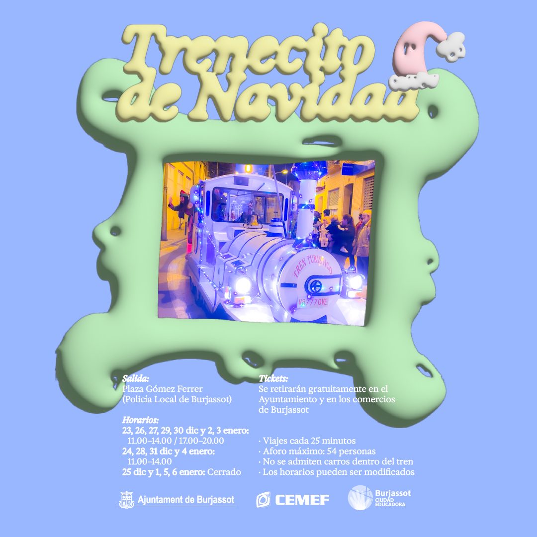 El Tren tendrá su salida desde la Plaza Gómez Ferrer, un poco más delante de la Policía Local de Burjassot, y su horario, del 23 de diciembre al 3 de enero, será de 11.00 a 14.00 horas y de 17.00 a 20.00 horas. El día 24 de diciembre, Nochebuena, junto a los días 28 y 31 de diciembre, y el 4 de enero de 2026, el tren sólo tendrá servicio por la mañana, de 11.00 a 14.00 horas.