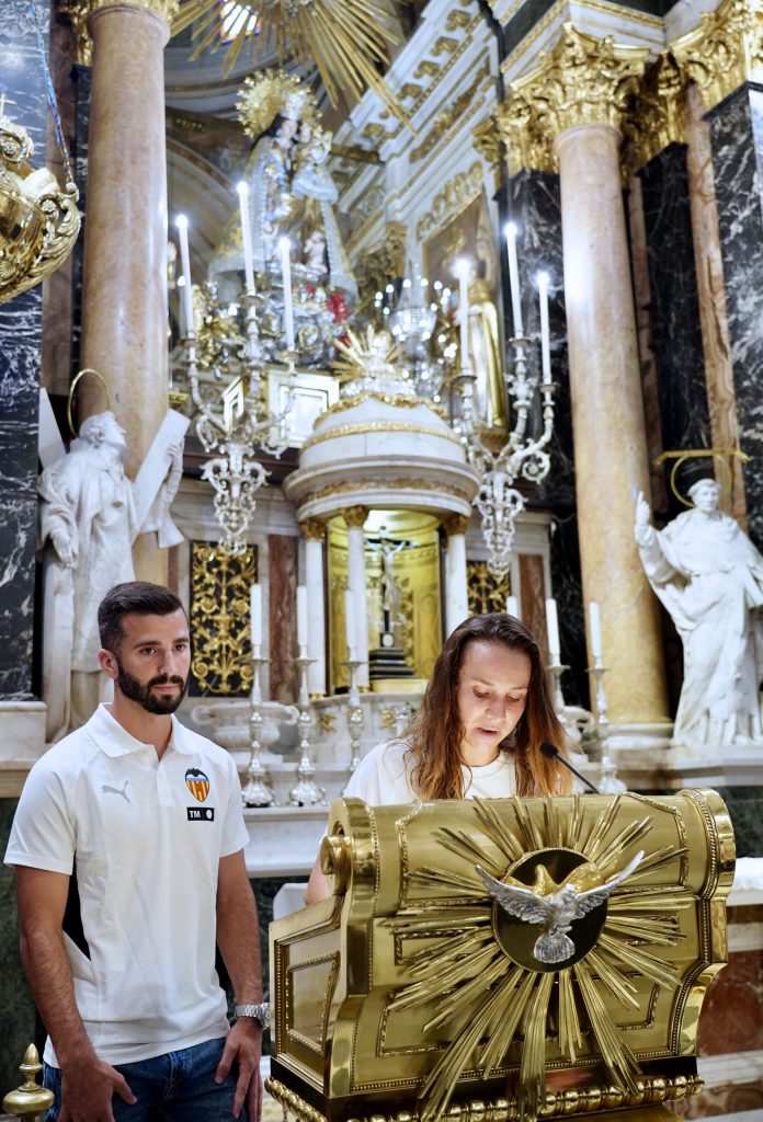Los capitanes de los dos equipos, José Luis Gayà y Pauleta Sancho han sido los encargados de ofrecer una oración y depositar las flores a los pies de la Virgen de los Desamparados.
