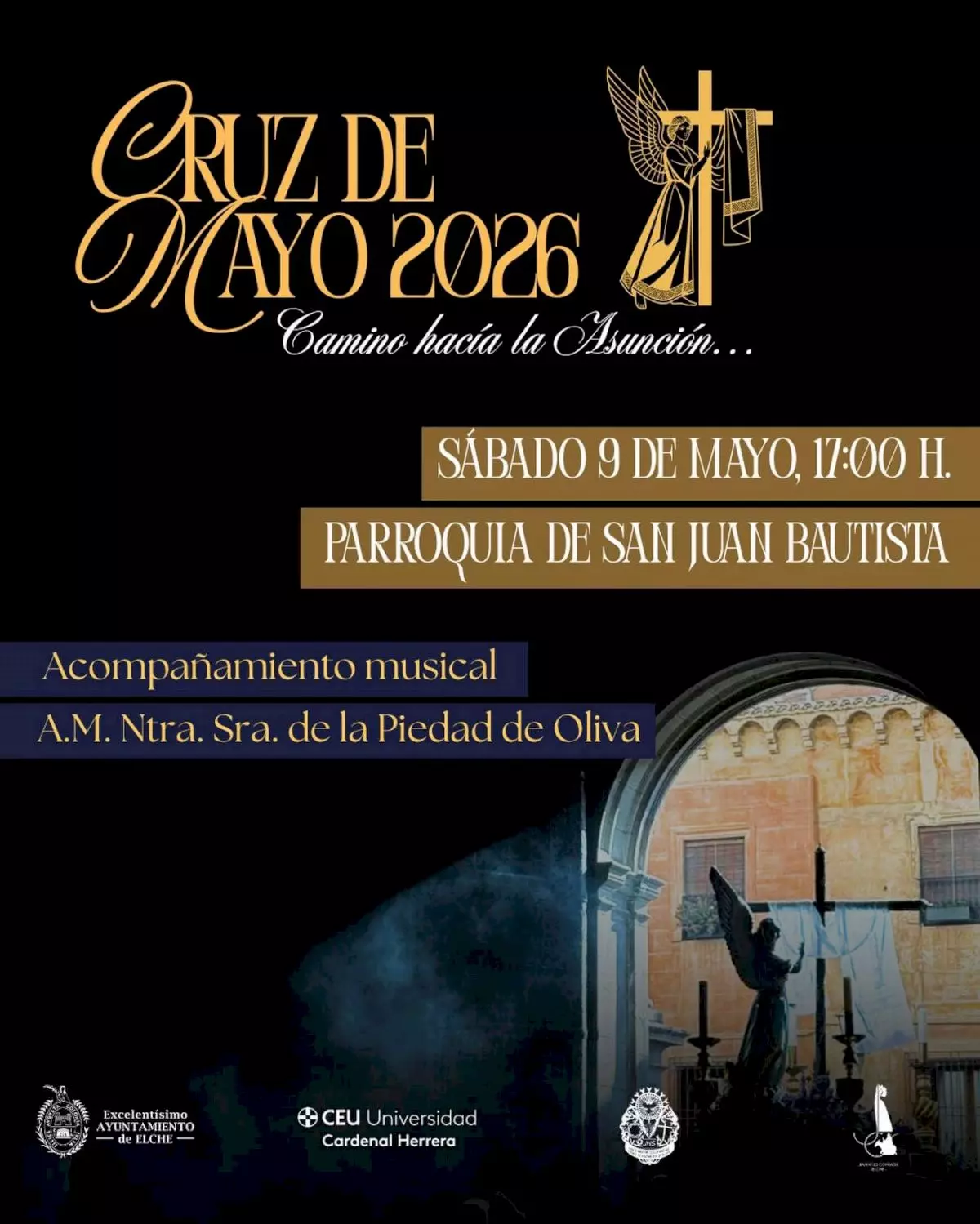 La Comisión de Juventud de la Junta Mayor de Cofradías y Hermandades de la Semana Santa de Elche, con el apoyo de la concejalía de Festejos, ha organizado un programa de actividades con motivo de la Cruz de Mayo que comienzan este jueves 30 de abril con el pregón a cargo de Adrián Cuenca de Castillo en el edificio Trinquet de la Universidad Cardenal Herrera CEU y que concluye con la procesión del día 9 desde la parroquia de San Juan Bautista.