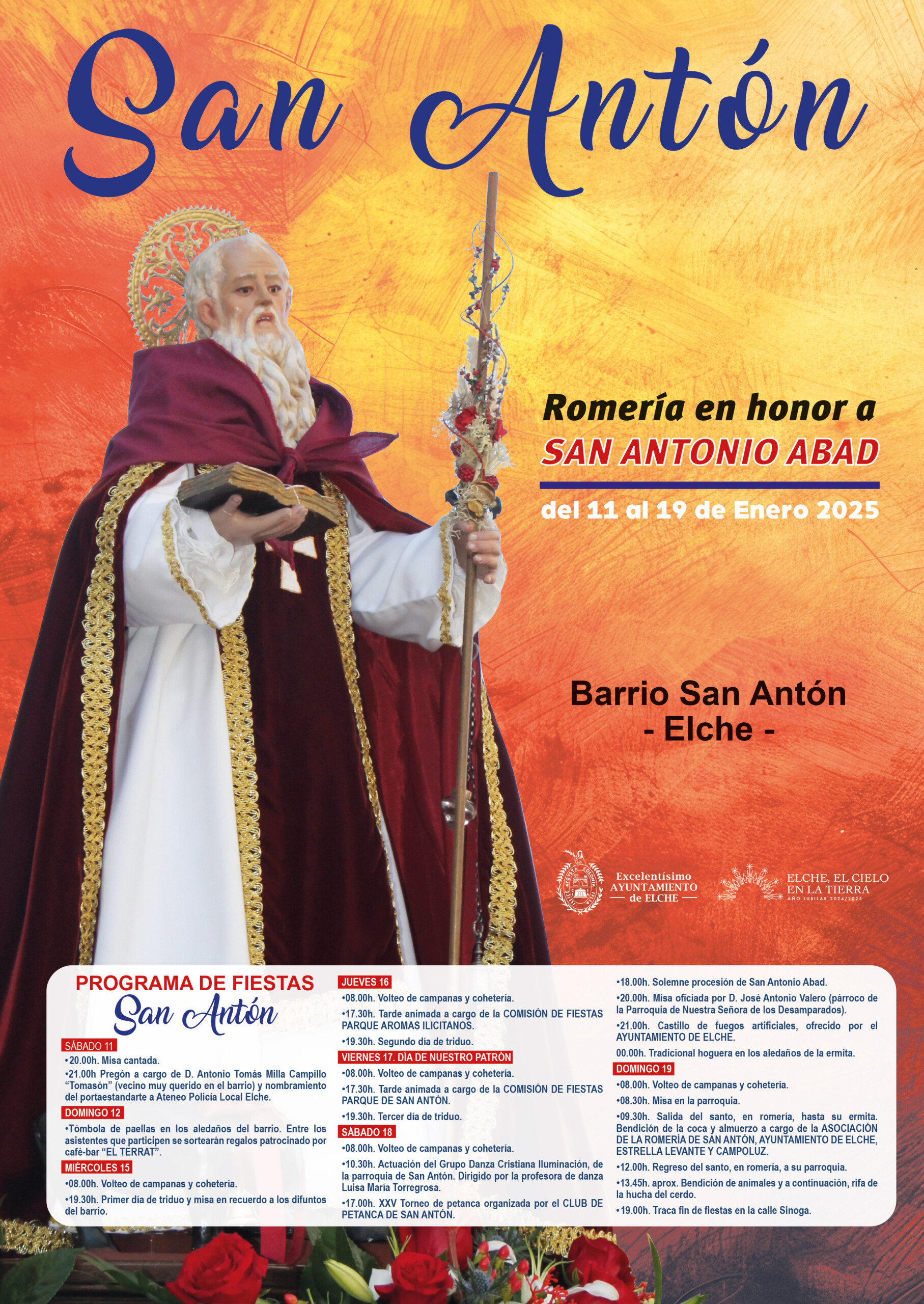 Las fiestas comenzarán el 11 de enero y se alargarán hasta el día 21. El próximo sábado a las 20:00 horas tendrá lugar la misa cantada en la parroquia de San Antón tras la que se llevará a cabo el pregón de las fiestas, este año a cargo de Antonio Tomás Milla Campillo, persona muy vinculada a las fiestas de Elche y vecino del barrio. Además, en el acto se nombrará portaestandarte al Ateneo de la Policía Local de Elche. Al día siguiente se celebrará la tradicional tómbola de paellas en los aledaños del barrio.