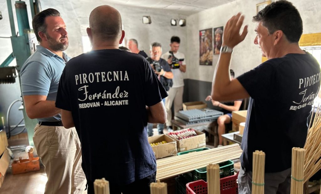 El alcalde, Pablo Ruz, junto a la edil de Festejos, Inma Mora, han visitado esta mañana la Pirotecnia Ferrández en Redován, la empresa encargada de la Nit de l’Albà desde 1989.