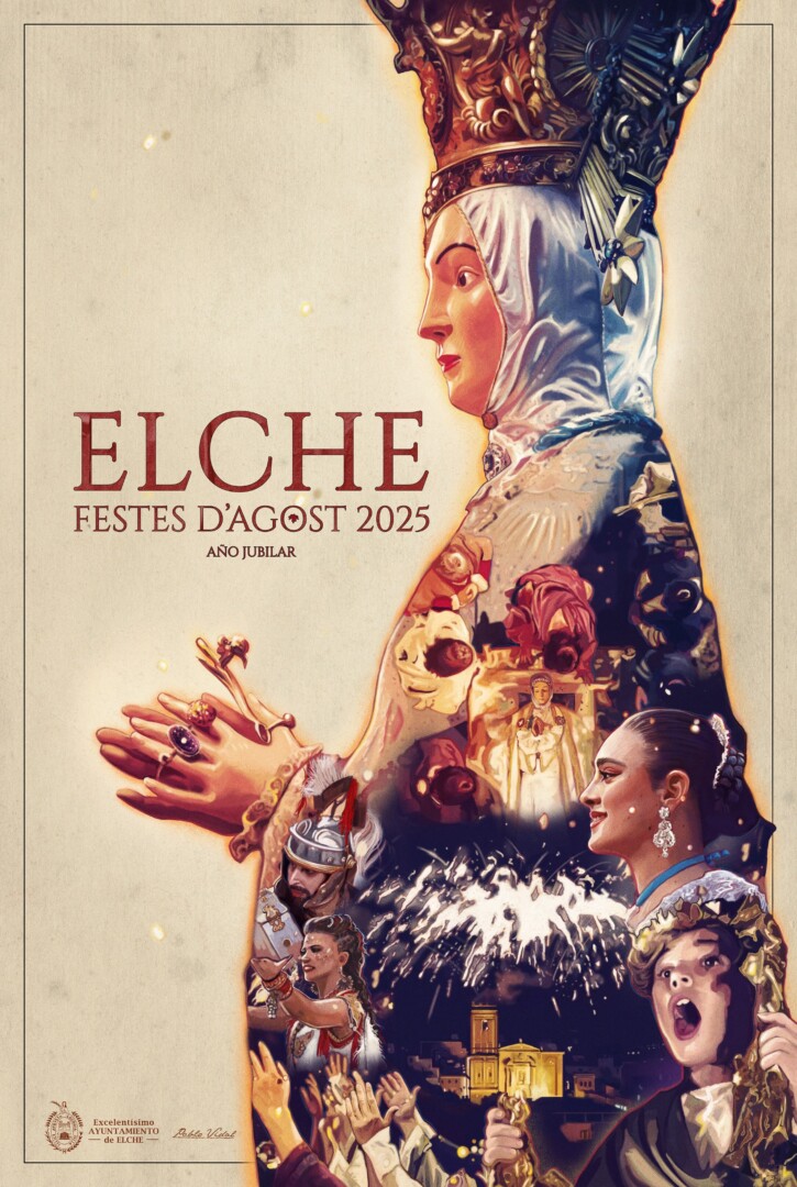 • El cartel es obra del ilicitano Pablo Vidal y la imagen central es la de la Virgen de la Asunción con la representación de los elementos principales de las fiestas reflejados en su manto