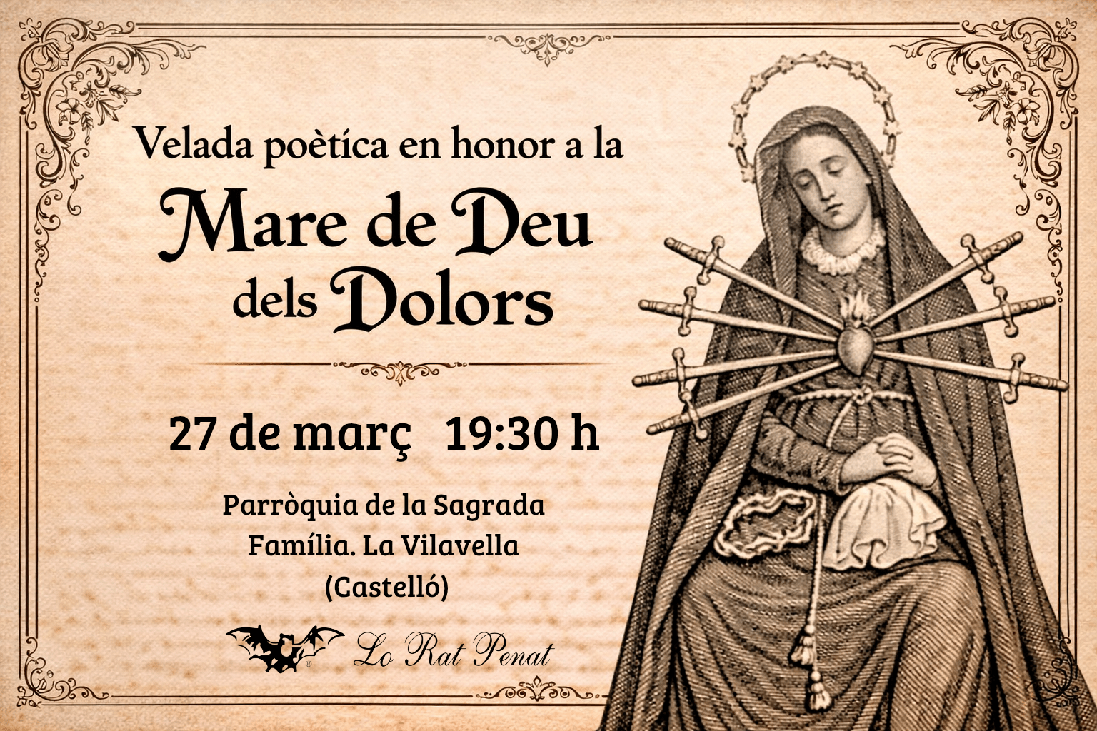 El pròxim divendres dia 27 de març, Lo Rat Penat celebrarà el tradicional acte poètic en honor a la Mare de Deu dels Dolors, Patrona dels Poetes Valencians. L’acte tindrà lloc a partir de les 19:30 h en la Parròquia de la Sagrada Família de La Vilavella (Castelló) (Plaça de la Vila, 1).