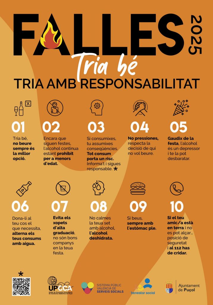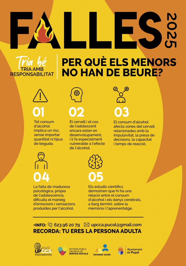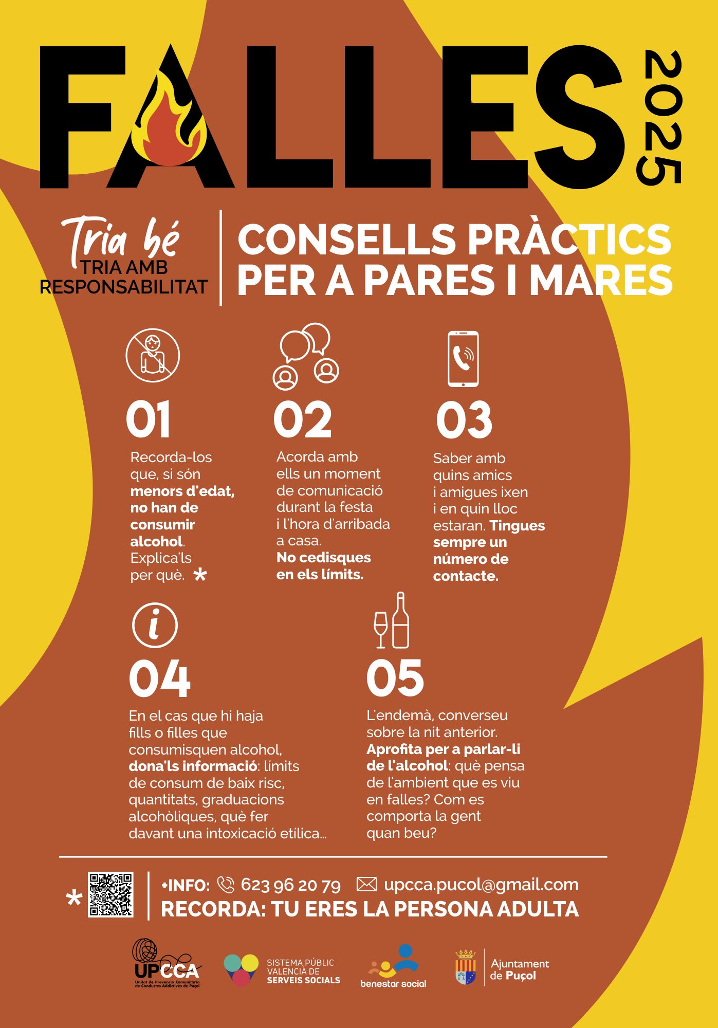 La UPCCA (Unidad de Prevención Comunitaria de Conductas Adictivas) de Puçol ha publicado una serie de consejos sobre el consumo de alcohol en fallas, dirigidos tanto a jóvenes como a padres y, en general, al vecindario de la población. Los consejos se han colocado de forma visible en los edificios públicos, los centros educativos y los casales falleros.