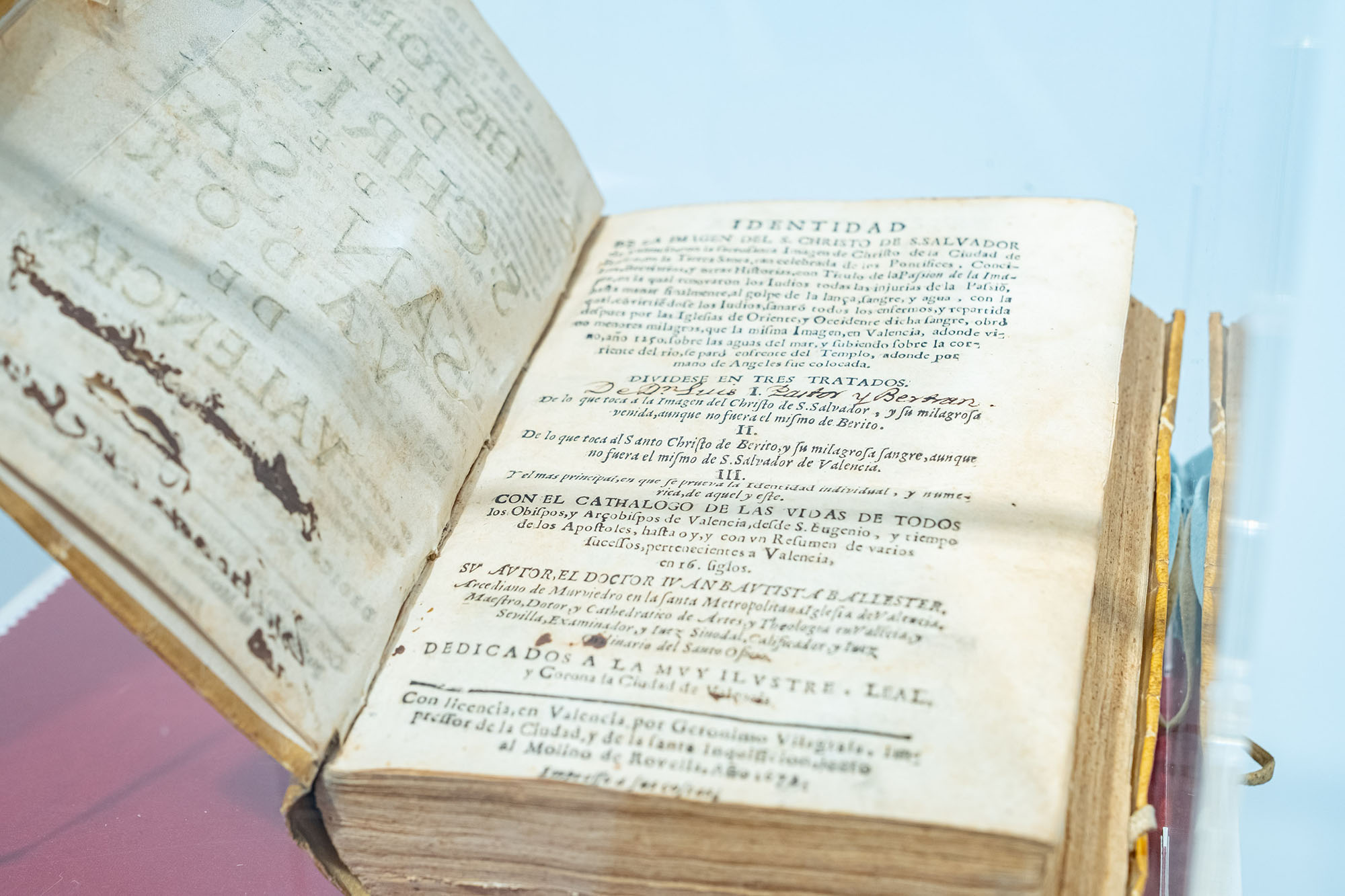Entre las piezas destacadas figura el ejemplar original del libro publicado en 1670 por un rector de la Iglesia del Salvador, canónigo de la Catedral, que intentó fundamentar desde el punto de vista teológico, histórico y devocional la identidad del Cristo con la tradición del crucifijo ultrajado de Berito. “Ese libro lo exponemos en una pieza aparte”, explica Goerlich, junto a grabados extraídos del propio volumen, entre ellos un mapa del Mediterráneo donde se representa la imagen navegando hacia Valencia, señalando únicamente los ríos Turia y Mijares.