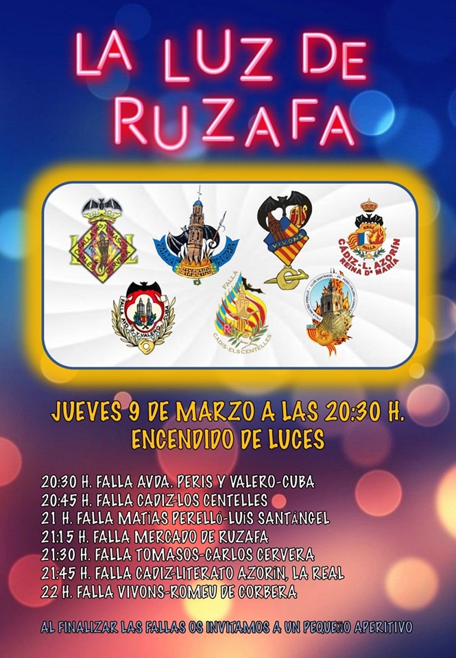 Pero este mismo día, siete comisiones del barrio de Russafa han organizado el espectáculo de «La Luz de Russafa» donde irán recorriendo en un pasacalle las demarcaciones para inaugurar las luces al paso de la comitiva. El acto empezará a las 20:30h y un pasacalle irá recorriendo cada demarcación para llevar a cabo el encendido. Al son de la música y los representantes de cada comisión irán dando luz a cada demarcación.