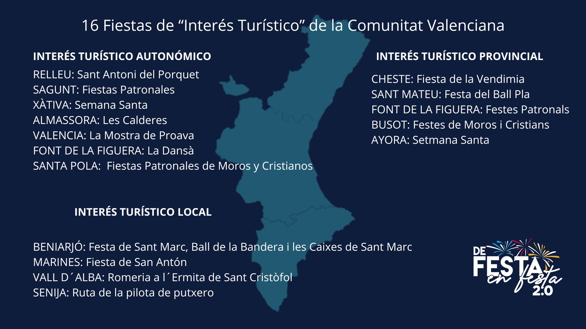 En concreto, se han concedido siete declaraciones de ‘Interés Turístico Autonómico’, cinco de ‘Interés Turístico Provincial’ y cuatro de ‘Interés Turístico Local’. Esta distinción reconoce aquellas celebraciones que destacan por su relevancia desde el punto de vista turístico y que reflejan el valor de la cultura y tradiciones populares valencianas.