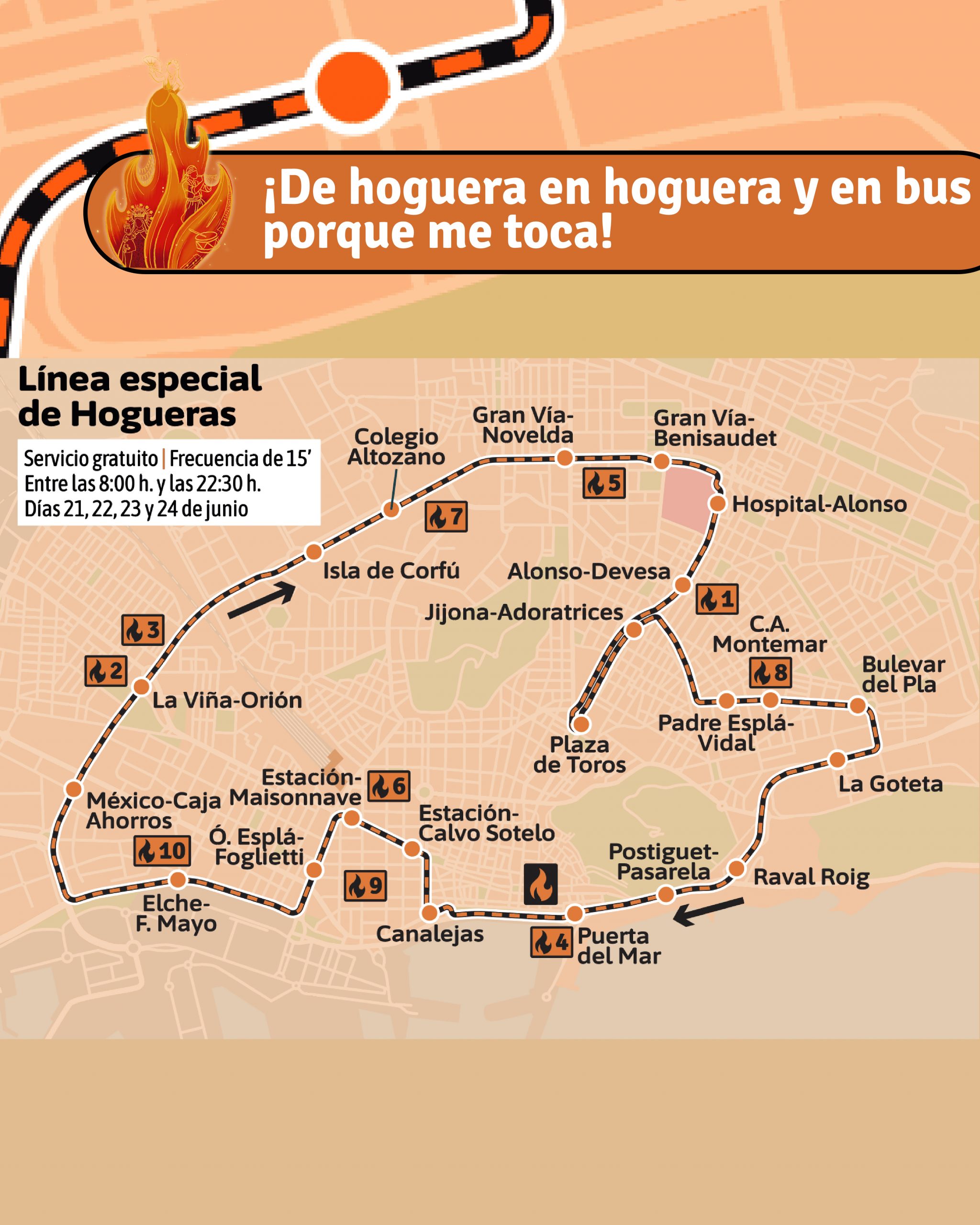 La línea especial de Hogueras prestará servicio gratuito entre este sábado 21 y el martes 24 de junio, ambos inclusive. El recorrido de la línea está diseñado para pasar cada 15 minutos lo más cerca posible de todas las hogueras que planten en categoría especial. Los usuarios podrán disfrutar de ella en horario de 8:00 a 22:30, en los días citados anteriormente.