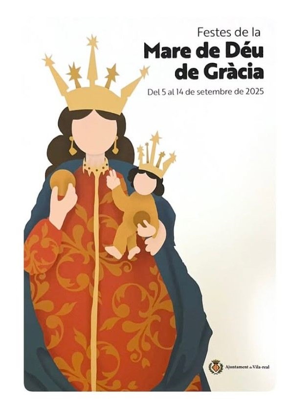 Por su parte, el cartel de las Festes de la Mare de Déu de Gràcia, lleva la firma de Laia Serrano Traver. La imagen muestra una interpretación moderna y simbólica de la Virgen con el Niño, ambas figuras con coronas y una estética de líneas limpias y colores vivos, que representa la devoción popular hacia la patrona.