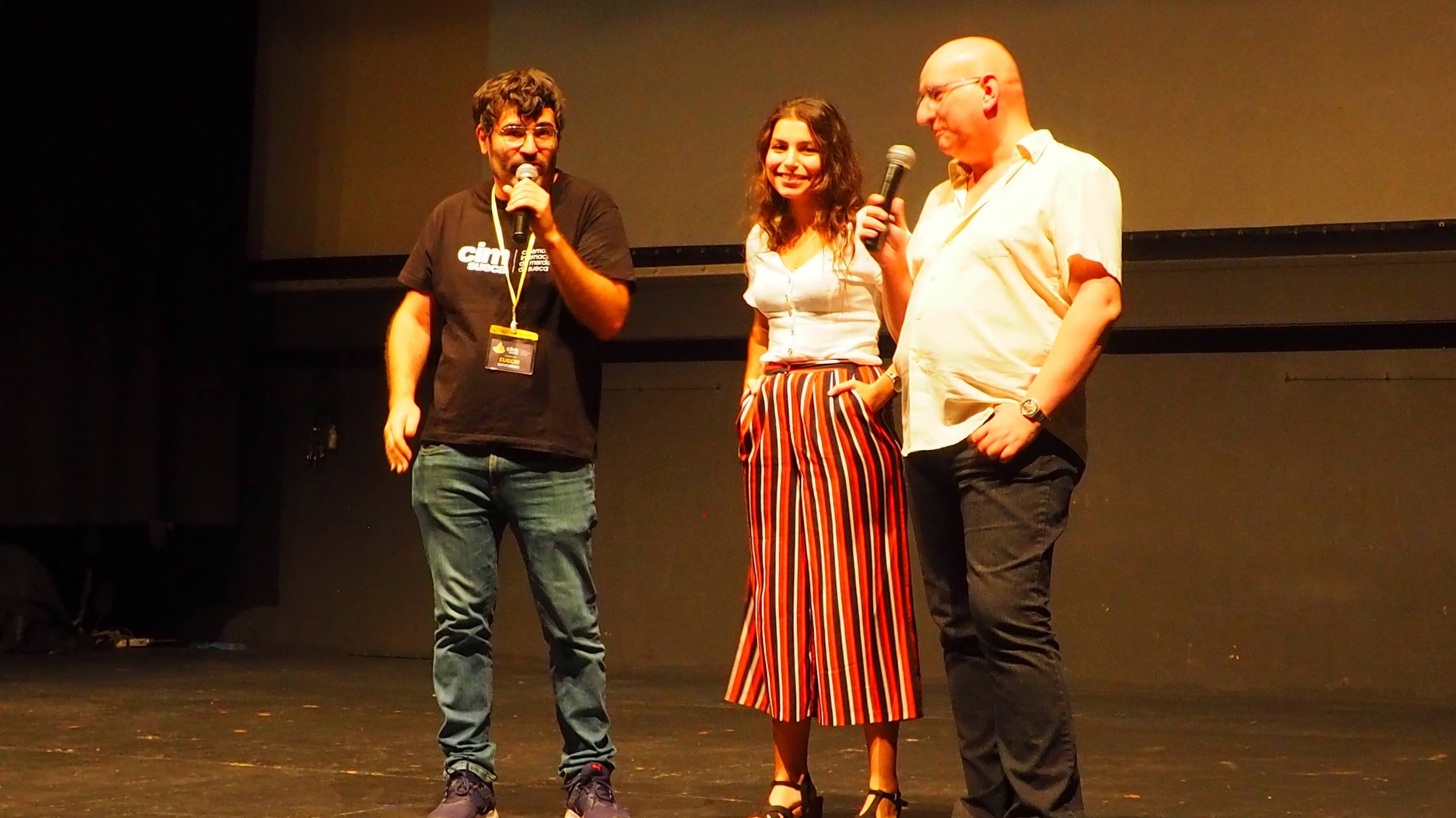 D’esquerra a dreta, Eugeni Alcañíz (organitzador del CIM Sueca), Tina Ruseva (Actriu de Misshapen), Joaquin Vallet (Director de Misshapen)