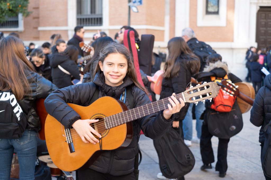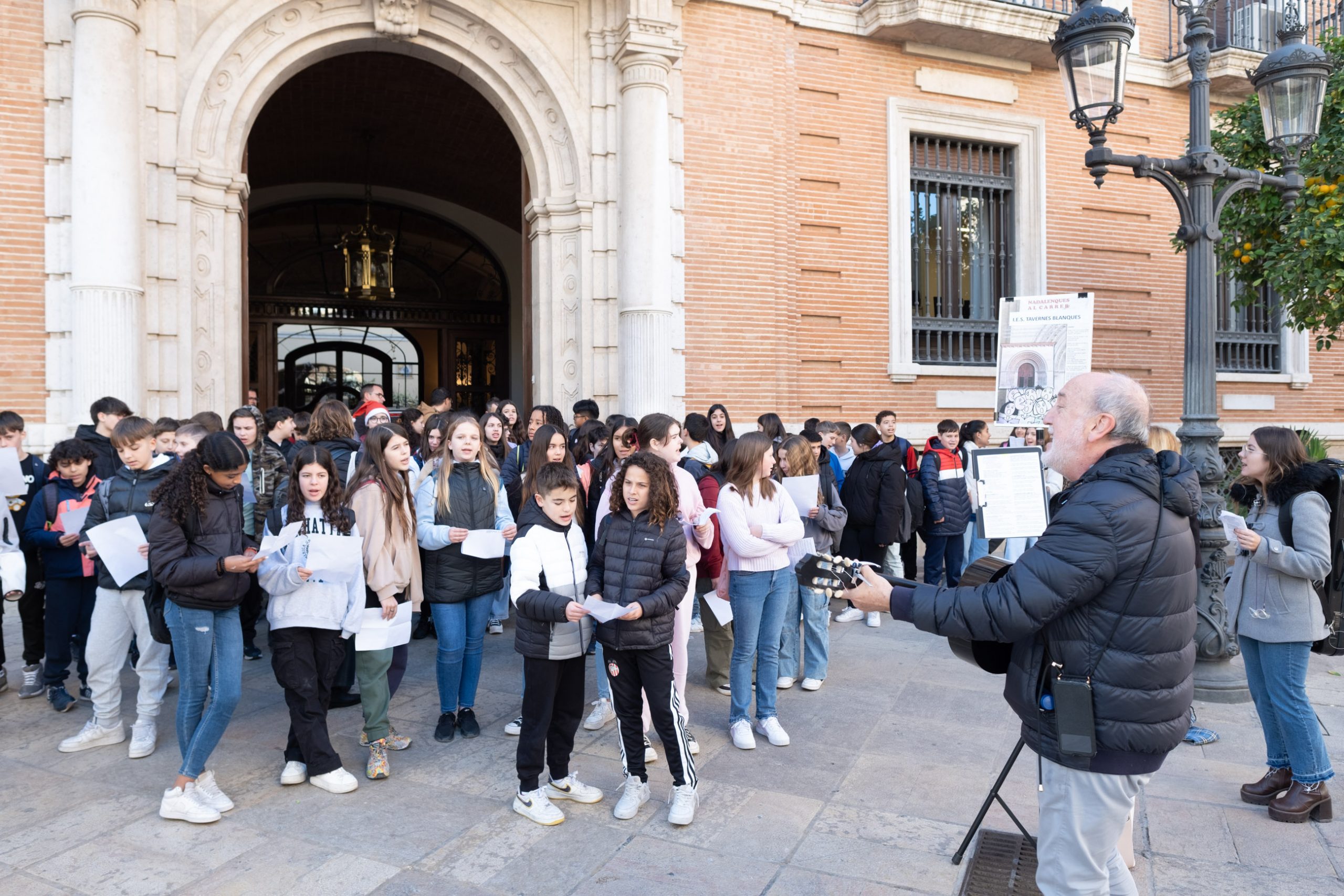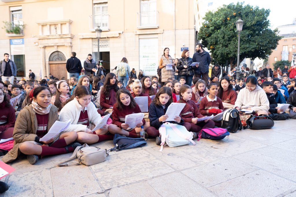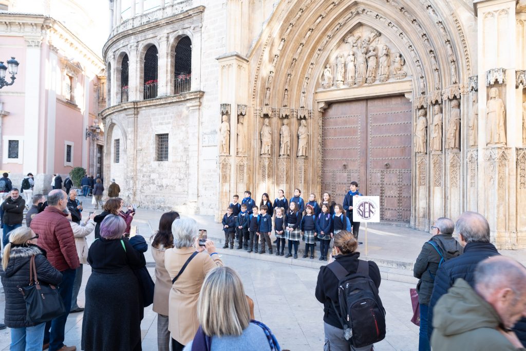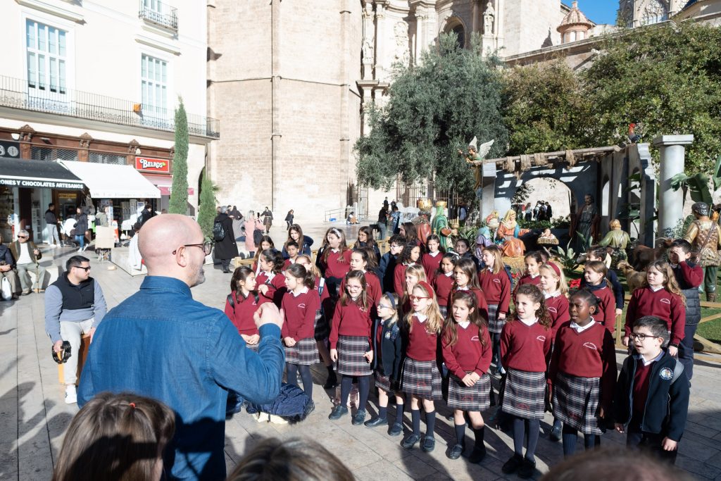 El acto consiste en cantar villancicos por diferentes puntos del centro histórico de Valencia, formando un coro cada uno de los colegios con sus alumnos.