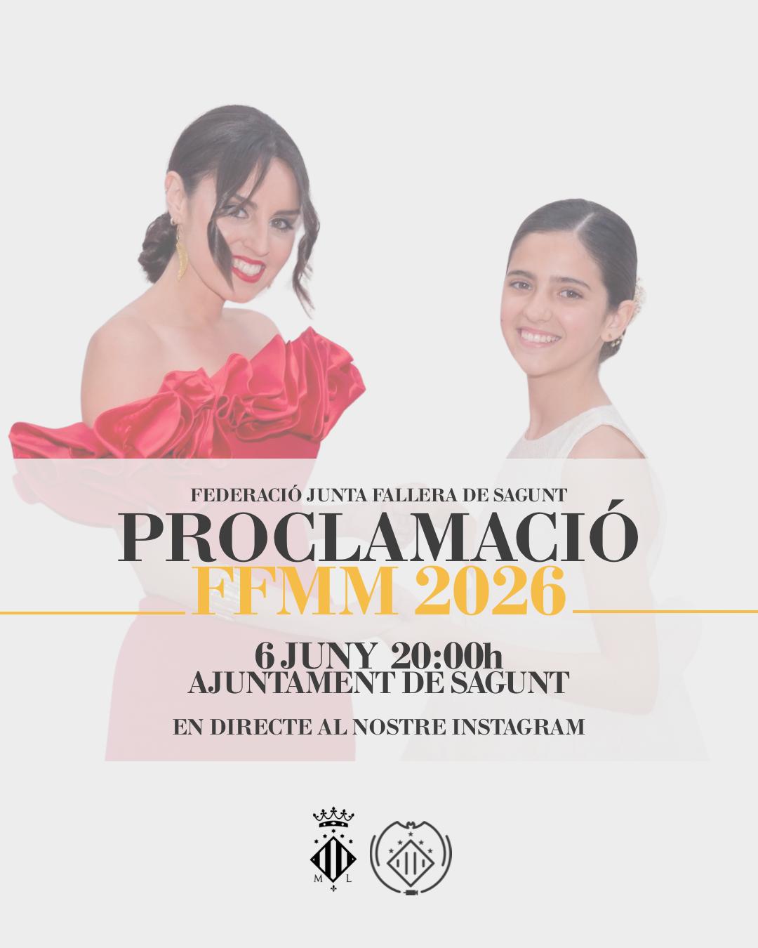 El salón de plenos del Ayuntamiento de Sagunt acogerá este viernes, 6 de junio, a las 20 horas, uno de los actos más destacados en el calendario fallero 2025-2026: la Proclamación de las Falleras Mayores de FJFS, Noa Barea Encinas y Ana Martínez Llopis, quienes, acompañadas de sus Cortes de honor, iniciarán su año como máximas representantes de la comarca de El Camp de Morvedre.