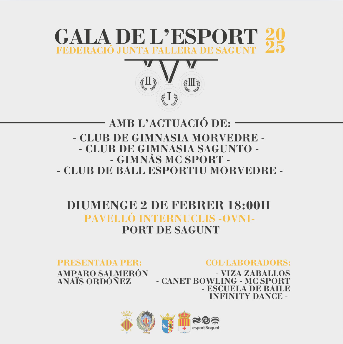 La gala estará presentada por Anaïs Ordóñez y Amparo Salmerón, periodistas de À Punt Esports con una amplia trayectoria en la cobertura de eventos deportivos. Su profesionalismo y carisma serán claves para darle un toque distintivo a esta velada tan especial. Asimismo, durante el acto se podrá disfrutar de actuaciones de varios clubes deportivos locales, como el Club de Gimnasia Morvedre, el Club de Gimnasia Sagunto, Gimnasio MC Sport y el Club de Ball Esportiu Morvedre, quienes pondrán de manifiesto su talento con actuaciones que fusionan el deporte y el arte, creando un ambiente festivo y dinámico.