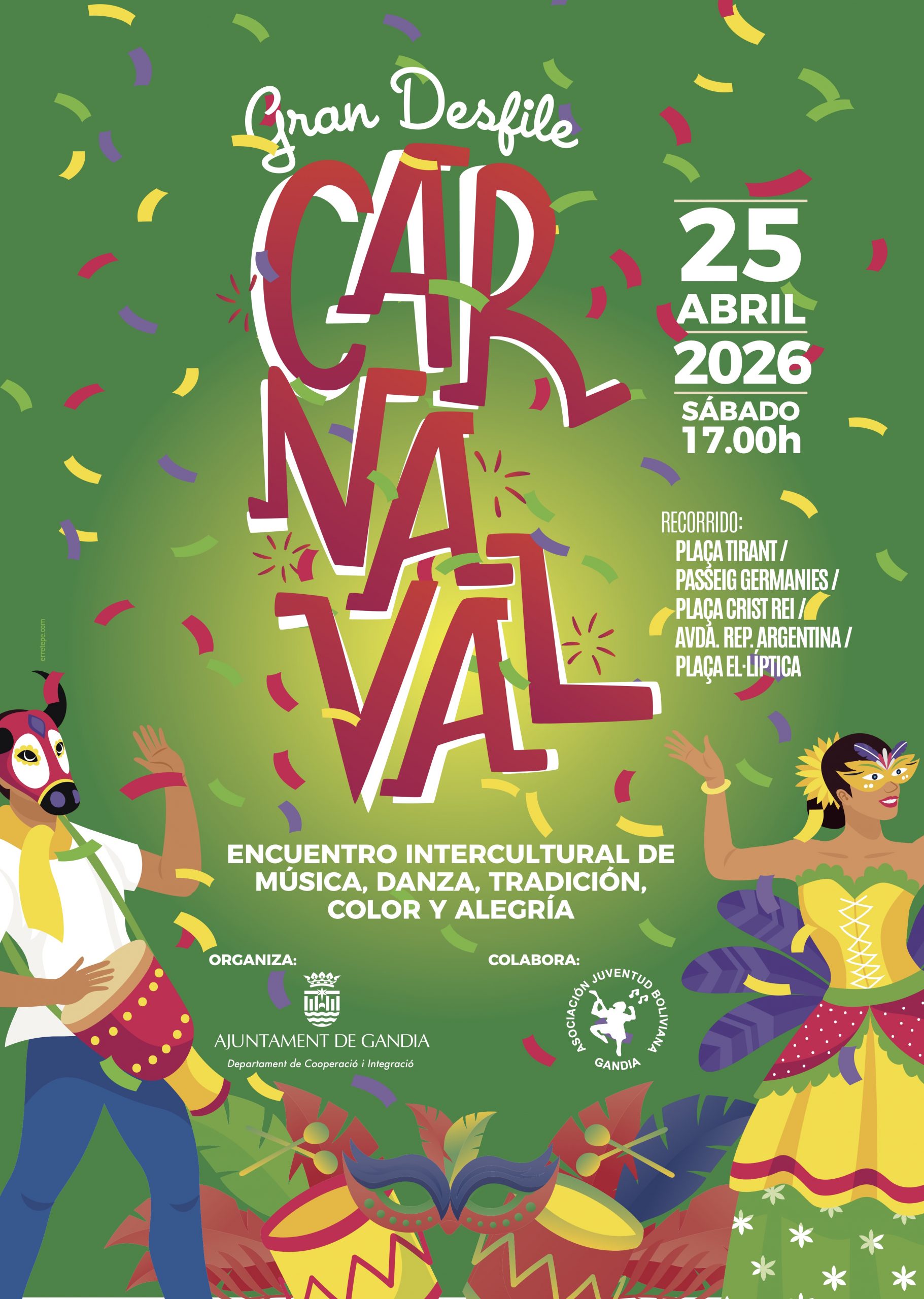 El pròxim dissabte 25 d’abril, els carrers de Gandia s’ompliran de música, dansa i color amb la celebració del II Festival de Carnestoltes Intercultural, organitzat per l’Associació Joventut Boliviana en col·laboració amb l’Ajuntament de Gandia.