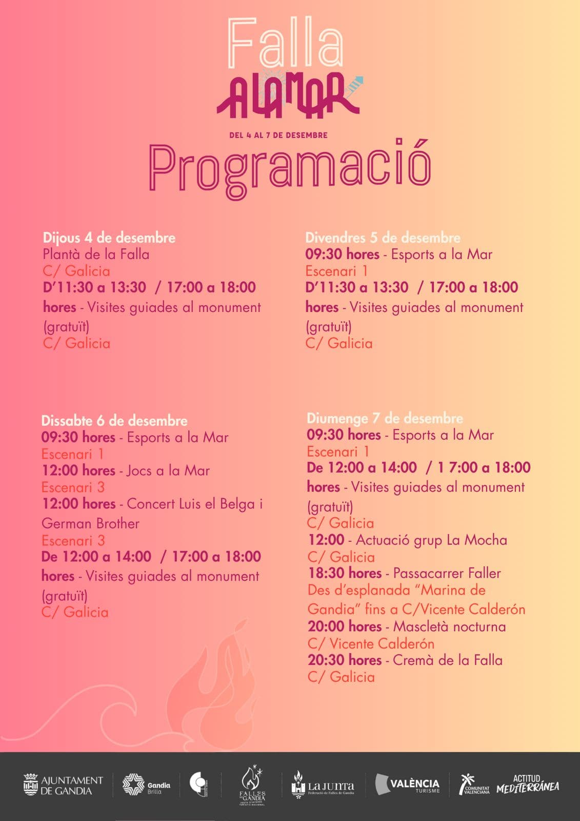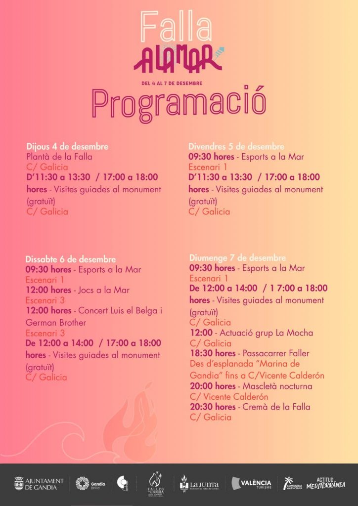 La ‘Falla a la Mar’ inclourà activitats per a tots els públics, combinant esport, música, gastronomia i les tradicionals festes falleres. L’epicentre de les celebracions serà el carrer Galícia, on s’instal·larà el monument i s’oferiran visites guiades gratuïtes tots els dies.