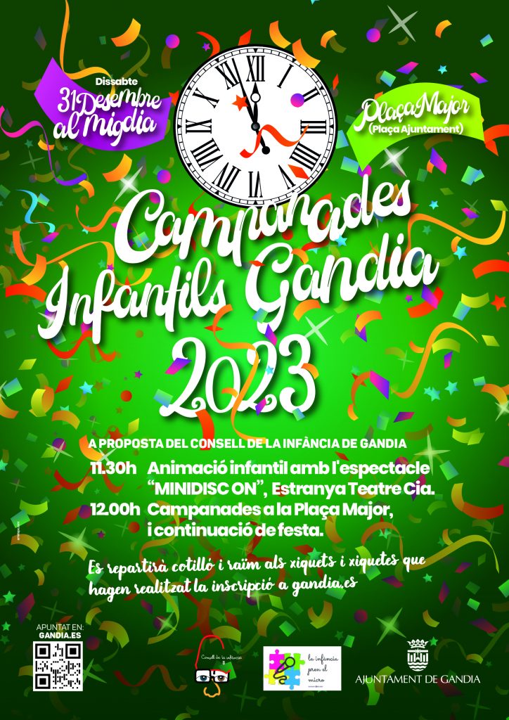 L’Àrea d’Infància i l’Àrea de Política Festiva de l’Ajuntament de Gandia han organitzat les primeres Campanades Infantils per a acomiadar l’any amb tota la infància de la localitat. Serà el dissabte, 31 de desembre, a la plaça Major a partir de les 11.30 hores.