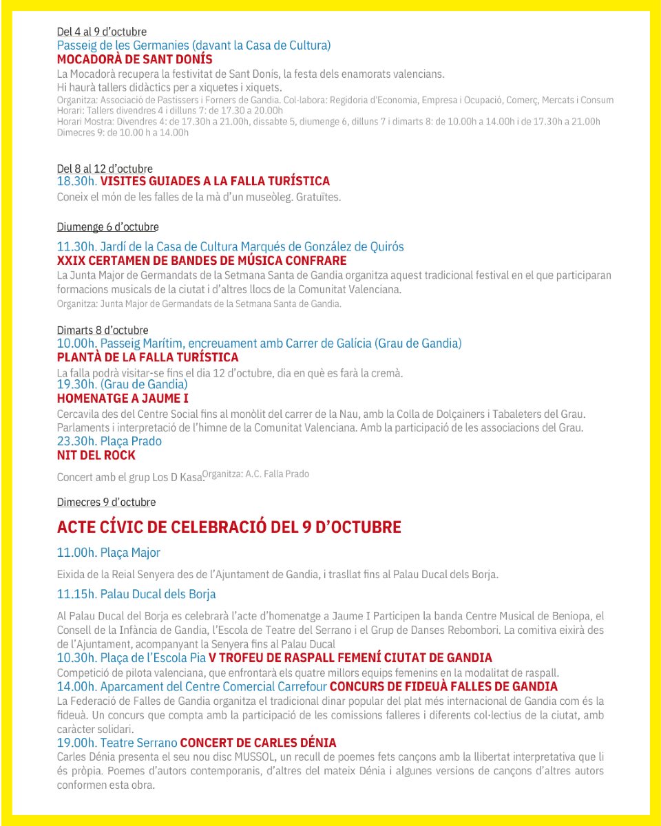 L’Ajuntament de Gandia ha presentat la programació de les diferents activitats que des de la passada setmana es desenvolupen a la ciutat amb motiu del 9 d’Octubre, Dia de la Comunitat Valenciana. Com cada any, aquest dia commemora l’entrada a la ciutat de València del rei d’Aragó Jaume I ‘El Conqueridor’ en 1238.