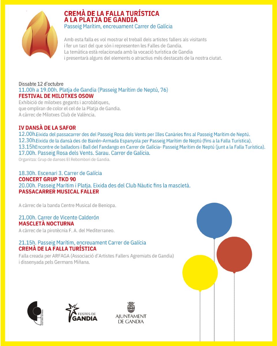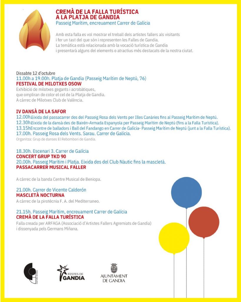 10.00h. Passeig Marítim, encreuament amb Carrer de Galícia (Grau de Gandia). La falla podrà visitar-se fins el dia 12 d’octubre, dia en què es farà la cremà.