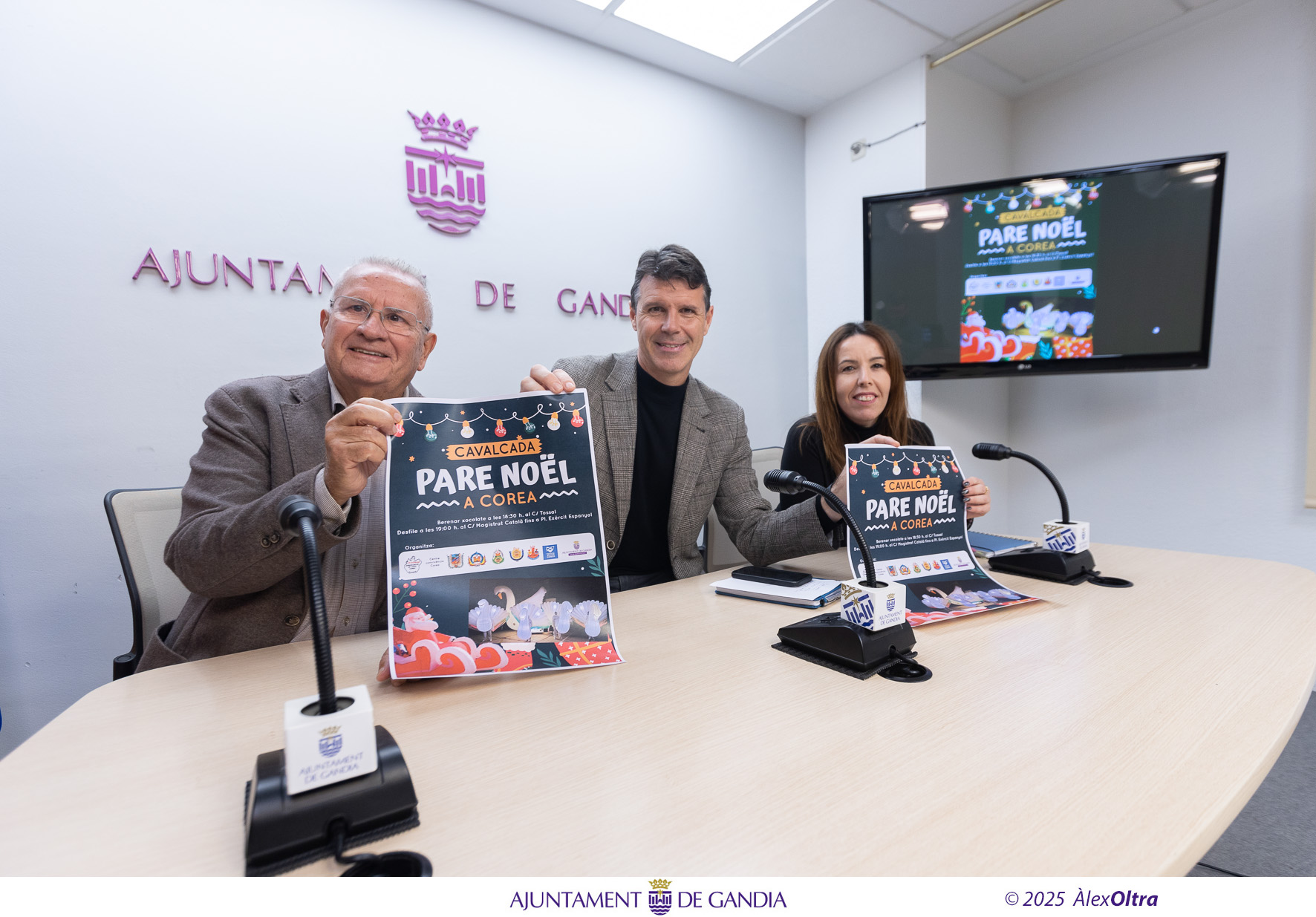 El president de la Junta de Districte de Corea, Jesús Naveiro; acompanyat d’Alfonso Rufat, president de l’Associació de Veïns de Corea, i Eva Ormeño, vicepresidenta de la Falla Serpis, ha presentat aquest matí la tradicional Cavalcada del Pare Noel que tindrà lloc el pròxim dimarts 23 de desembre al barri.