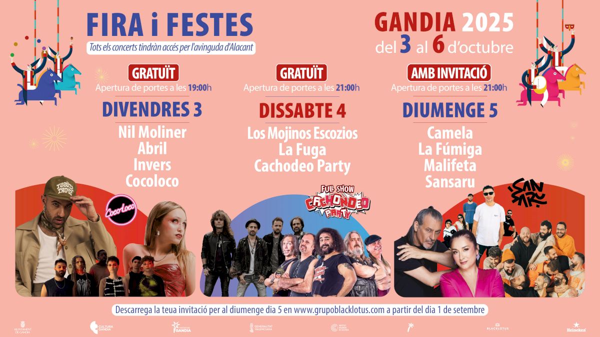 Tots els concerts de la Fira i Festes 2025 seran gratuïts. Així ho ha anunciat hui l’alcalde de Gandia, José Manuel Prieto, que ha comparegut en roda de premsa juntament amb la regidora delegada de Cultura i Fira i Festes, Balbina Sendra, i Almudena Santos, en representació de l’empresa Black Lotus, promotora dels concerts.
