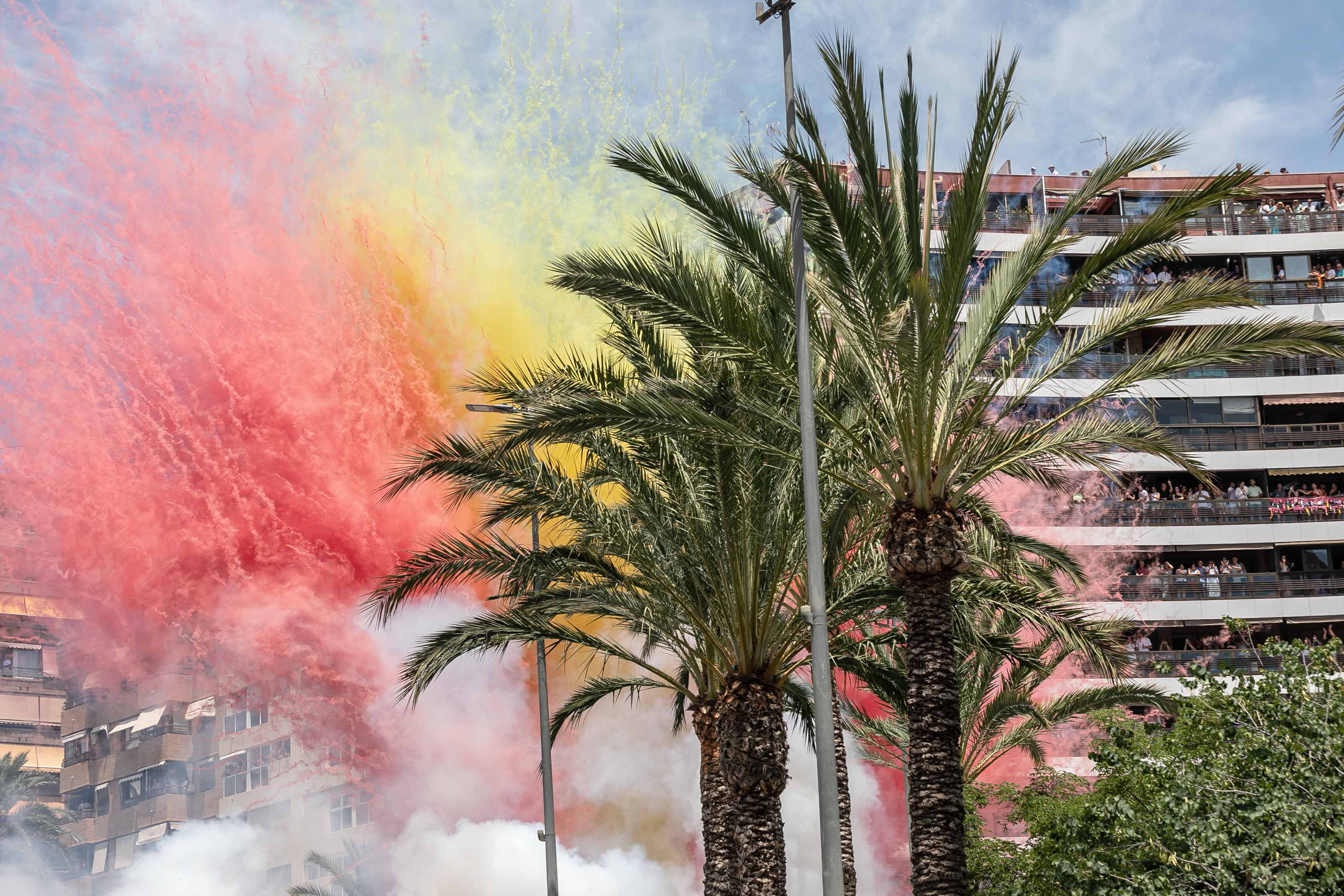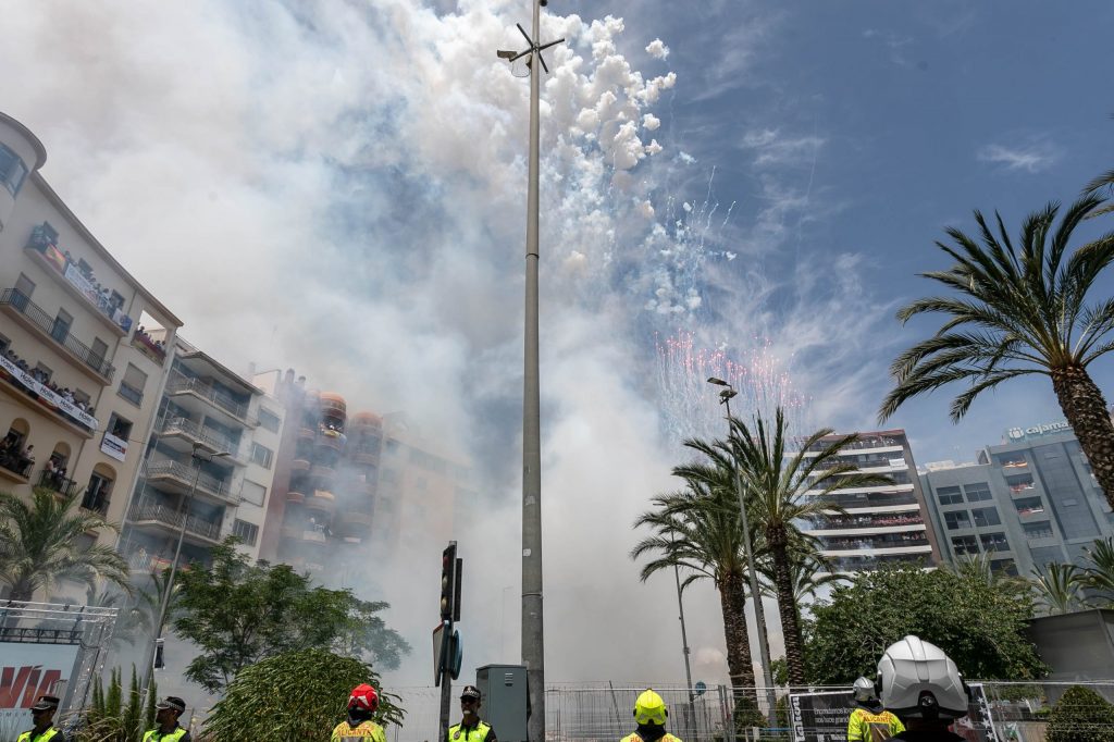 Dos morteros con efectos digitales han abierto el disparo conjugando una sucesión de dobles efectos con distintos artificios. Entre ellos, sonidos con pitos con trueno -uno de ellos, el mencionado tritono-, zumbadoras, serpentinas rojas y verdes, y torbellinos con trueno. Ha continuado el Cuerpo Central conformado por seis retenciones terrestres con fuego aéreo a base de pitos con truenos, serpentinas y carcasas detonantes que han ido ‘in crescendo’ hasta el colofón de esa parte.