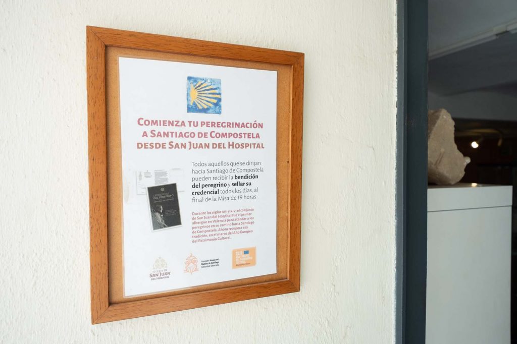 La vinculación de esta iglesia, como lugar que acogía a los peregrinos, con el Camino de Santiago quedó también patente tras los trabajos de recuperación del Conjunto Histórico de San Juan del Hospital de hace unos años, ya que aparecieron labras de piedra y objetos de clara simbología y procedencia de Santiago de Compostela. Entre ellos canecillos –cabeza de la viga que asoma al exterior y sostiene una cornisa- con forma de vieiras y azabaches gallegos: cuentas de rosarios, colgantes de peregrinos o dedales que traían ya de vuelta de Galicia. Además de conchas, agujereadas para los cordones, encontradas sobre el pecho de los esqueletos. Estos hallazgos, tanto del siglo XIII como del XIV, que se han descubierto en las excavaciones, son únicos en la Comunidad Valenciana y no se han encontrado en ninguna otra iglesia del camino hacia Santiago de Compostela.