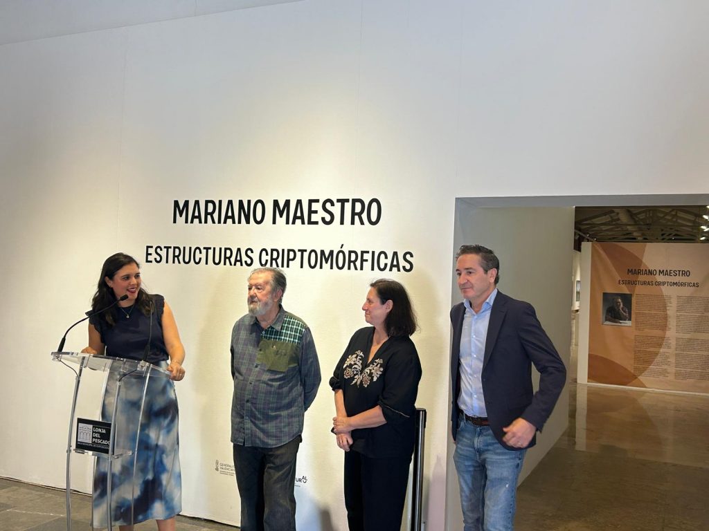 La abstracción geométrica de Mariano Maestro se expone por primera vez en Alicante de la mano del Consorci de Museus de la Comunitat Valenciana (CMCV). La muestra “Mariano Maestro. Estrcuturas criptomórficas” ha sido inaugurada este viernes en la sala de exposiciones de La Lonja del Pescado por parte de la secretaria autonómica de Cultura, Pilar Tébar, la concejala de Cultura, Nayma Beldjilali, el gerente del CMCV, Nicolás Bugeda, y el propio autor.