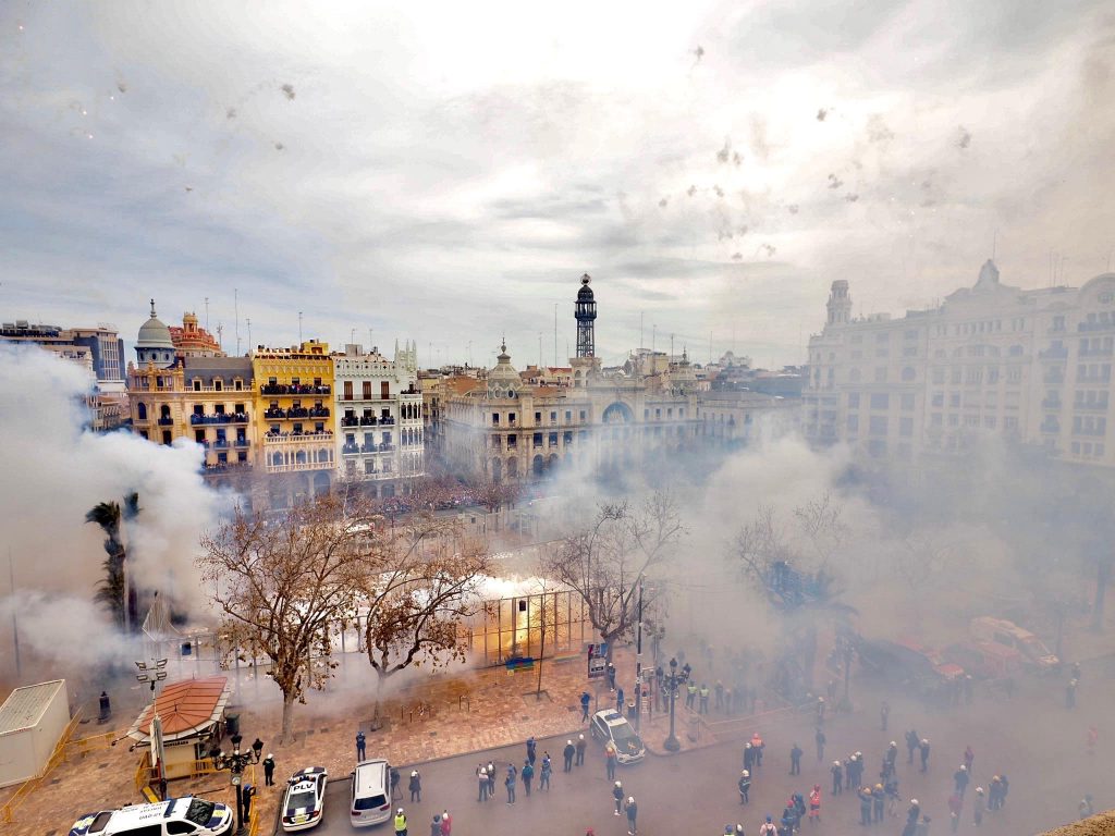 La mascletà de hoy ha sido con cohetes combinados con terrestres, martillos terrestres continuos rodeando la plaza, un diálogo a dos extremos de la plaza y un final atronador.