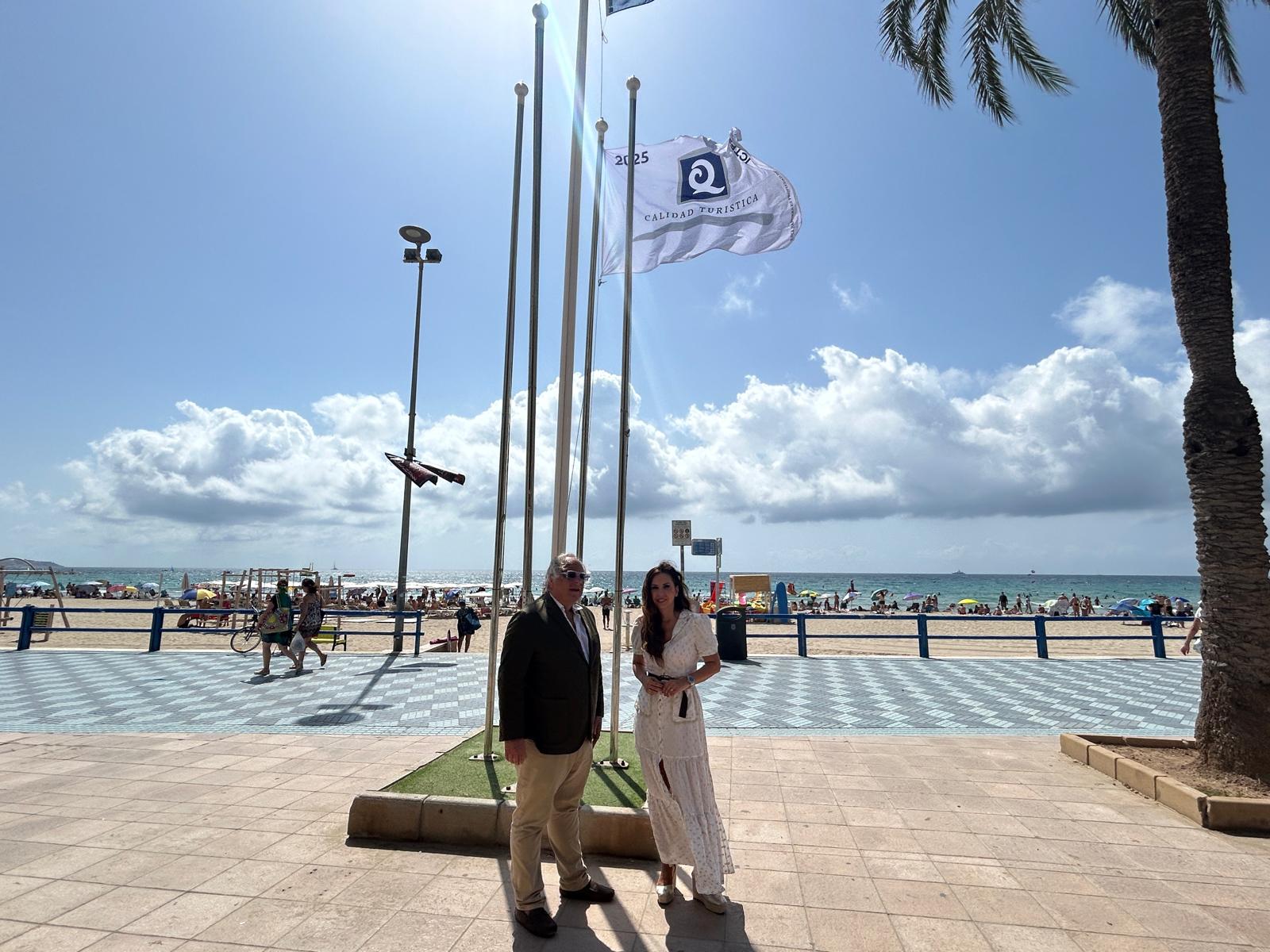 La bandera Q de Calidad Turística ya ondea en la playa del Postiguet. La concejala de Turismo, Ana Poquet, y el el presidente del ICTES, el Instituto para la Calidad Turística Española y la Sostenibilidad, Miguel Mirones, la han izado este martes. La bandera Q de Calidad Turística certifica la calidad del arenal y sus servicios y ondea en el Postiguet de forma ininterrumpida desde 2021.