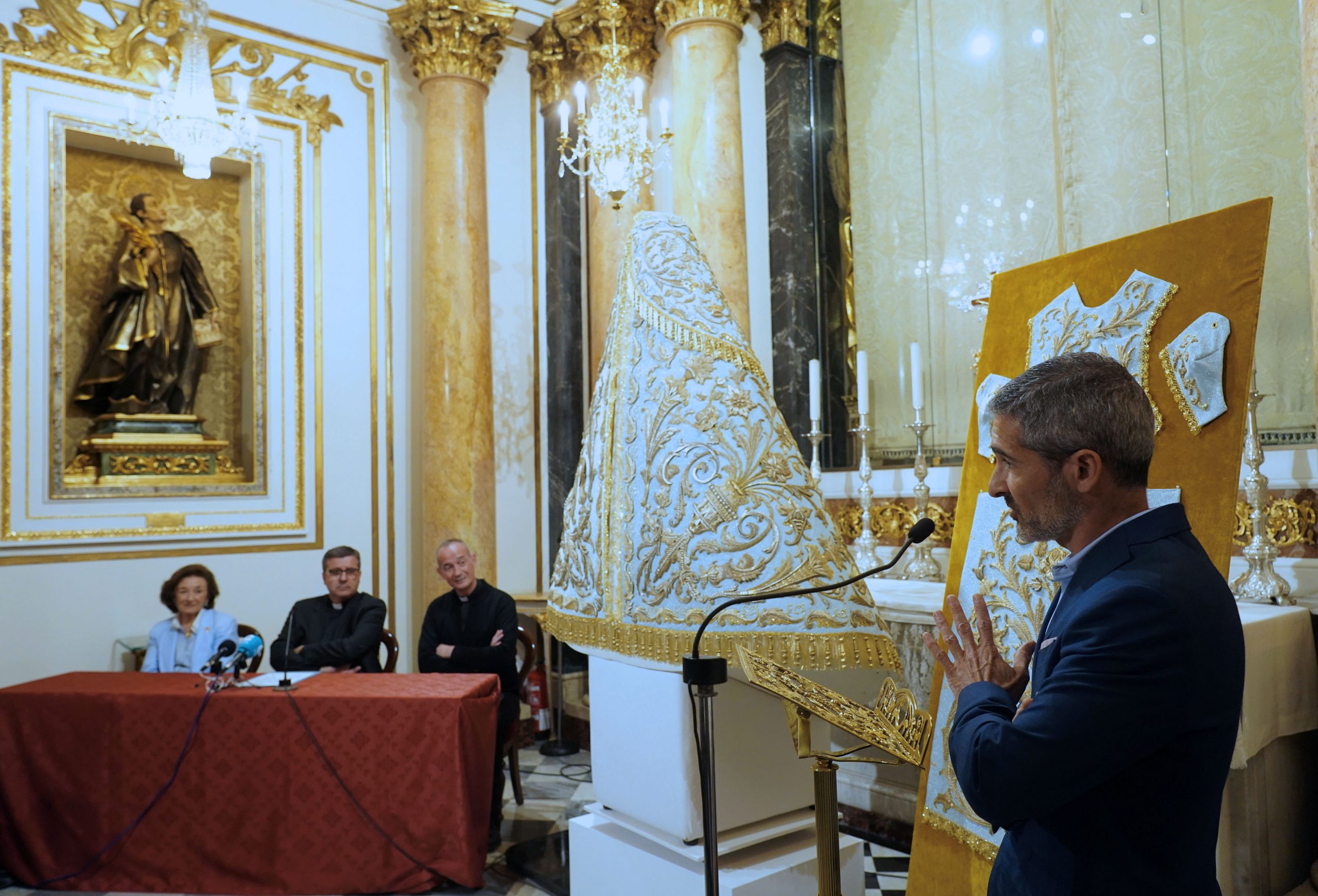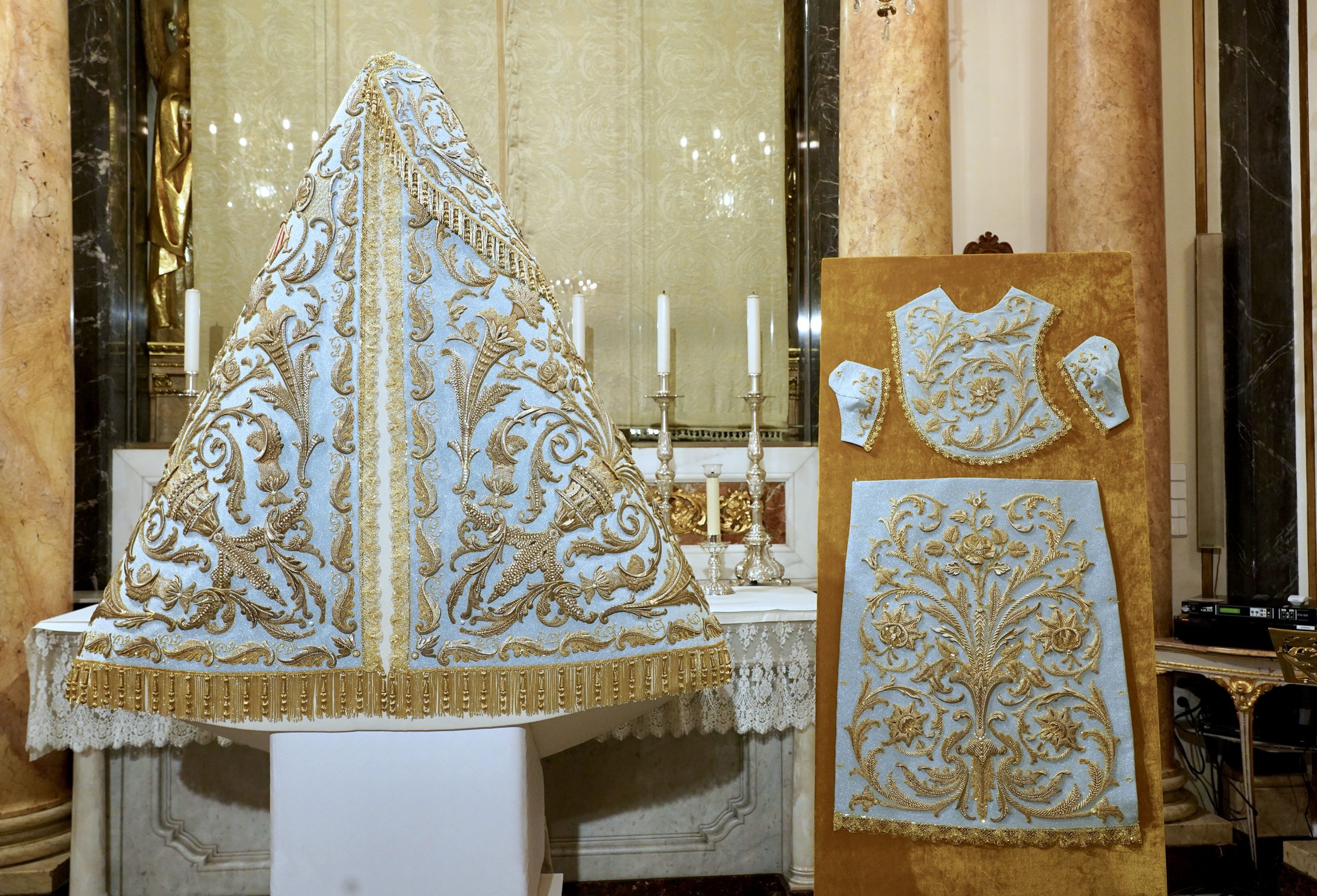 Se trata del manto “que la ciudad de Valencia regaló a la patrona en 1954 en el marco del Año Mariano convocado por el Papa Pío XII con motivo del centenario de la proclamación del Dogma de la Inmaculada Concepción”, tal y como ha explicado Juan Melchor Seguí, rector de la Basílica de la Virgen de los Desamparados.