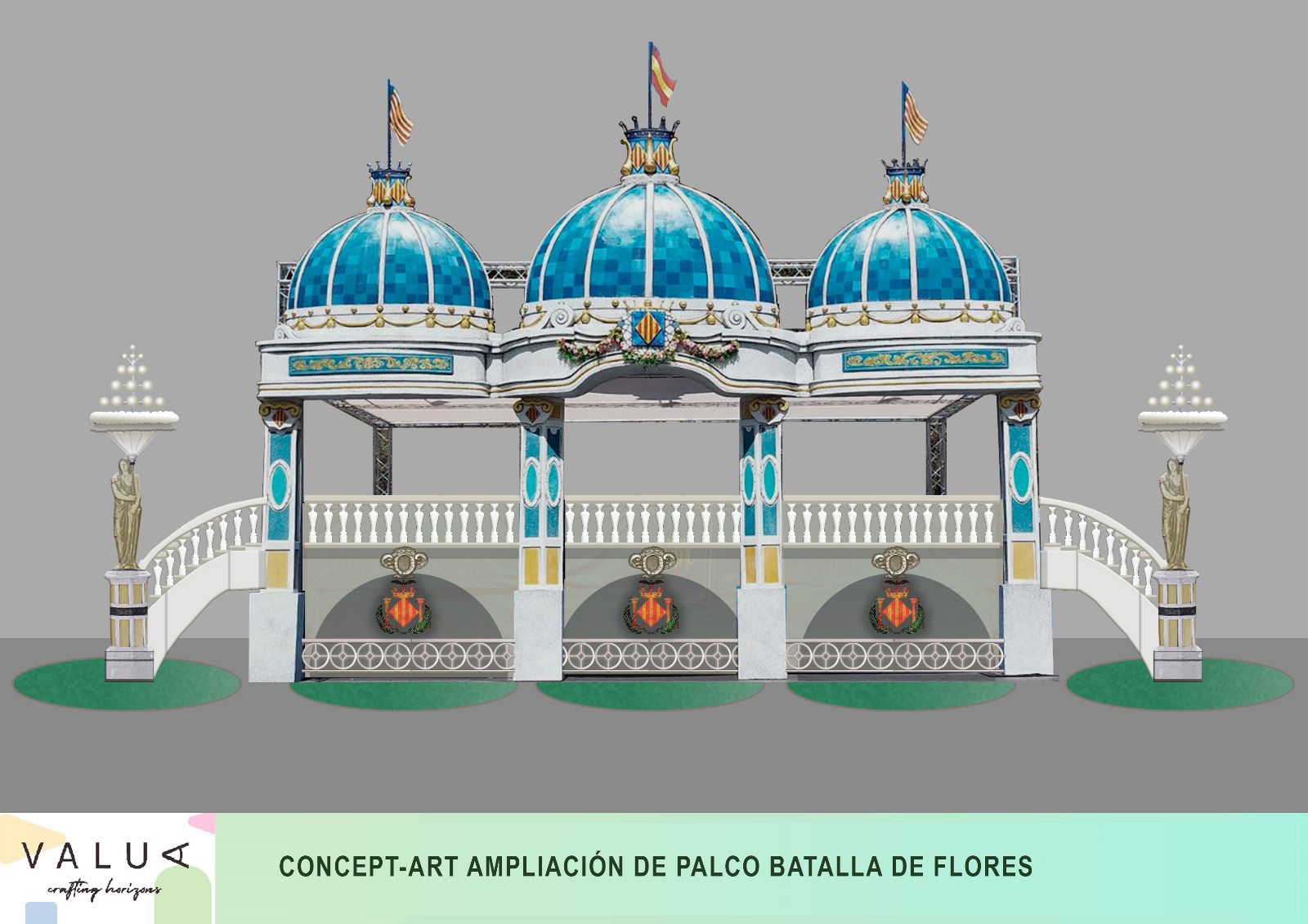 La empresa Valua ha sido la encargada de realizar los trabajos para que el domingo los valencianos y valencianas puedan disfrutar del frontal completo del desaparecido Pabellón Municipal de Cortina. Las tres cúpulas con la bandera nacional y las regionales volverán a coronar el paseo de l’Albereda en la batalla floral más antigua de España.