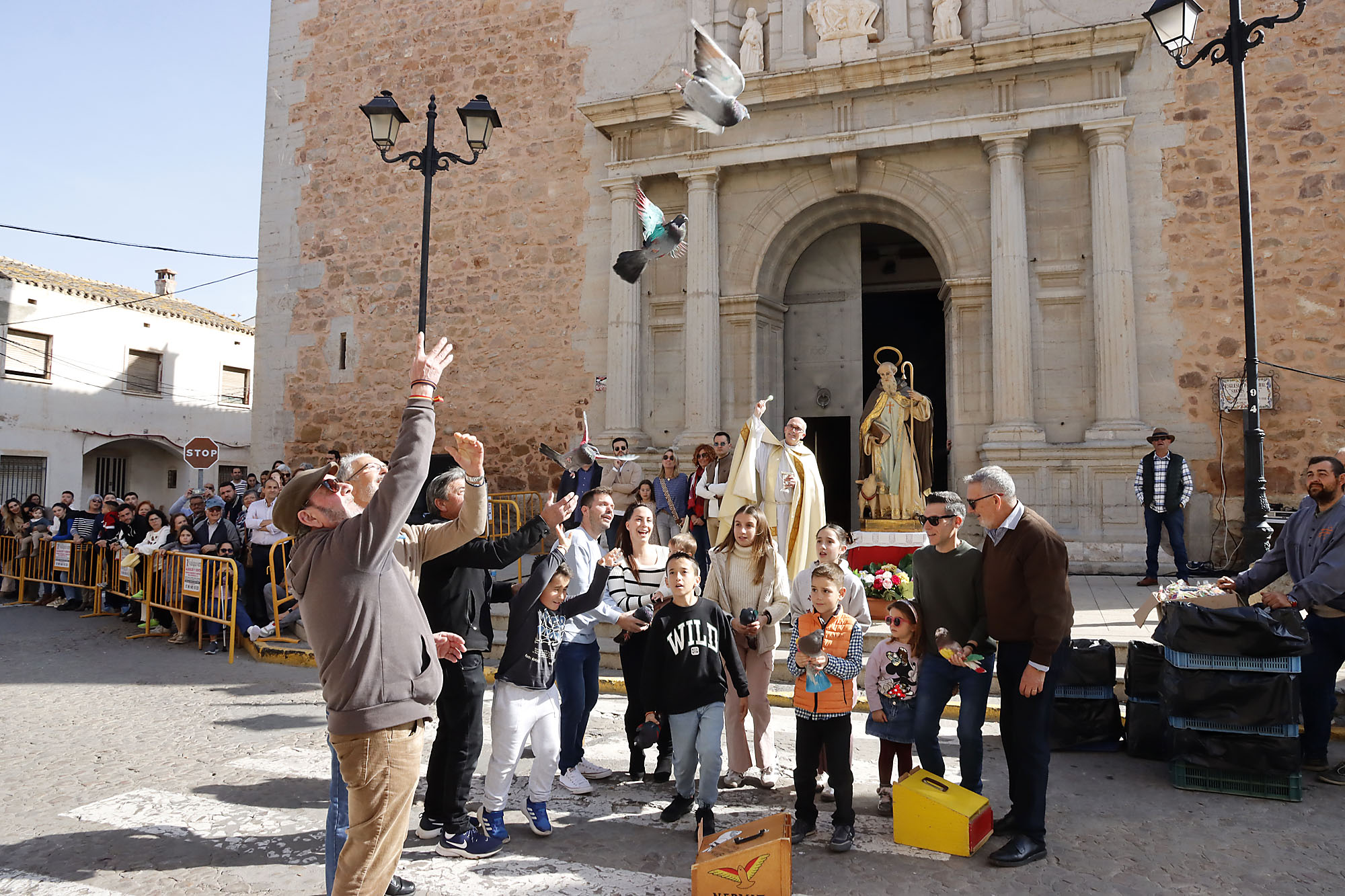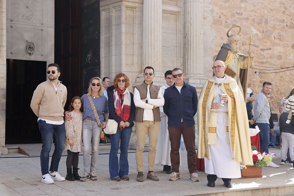 Finalizada la misa, el párroco procedió la bendición de los detalles, un momento que marca el inicio de la celebración. Primero, la foto oficial de la organización, con representantes de la Asociación y del Ayuntamiento; a continuación, la suelta de palomos a cargo de la Asociación de Colombaires de Puçol.