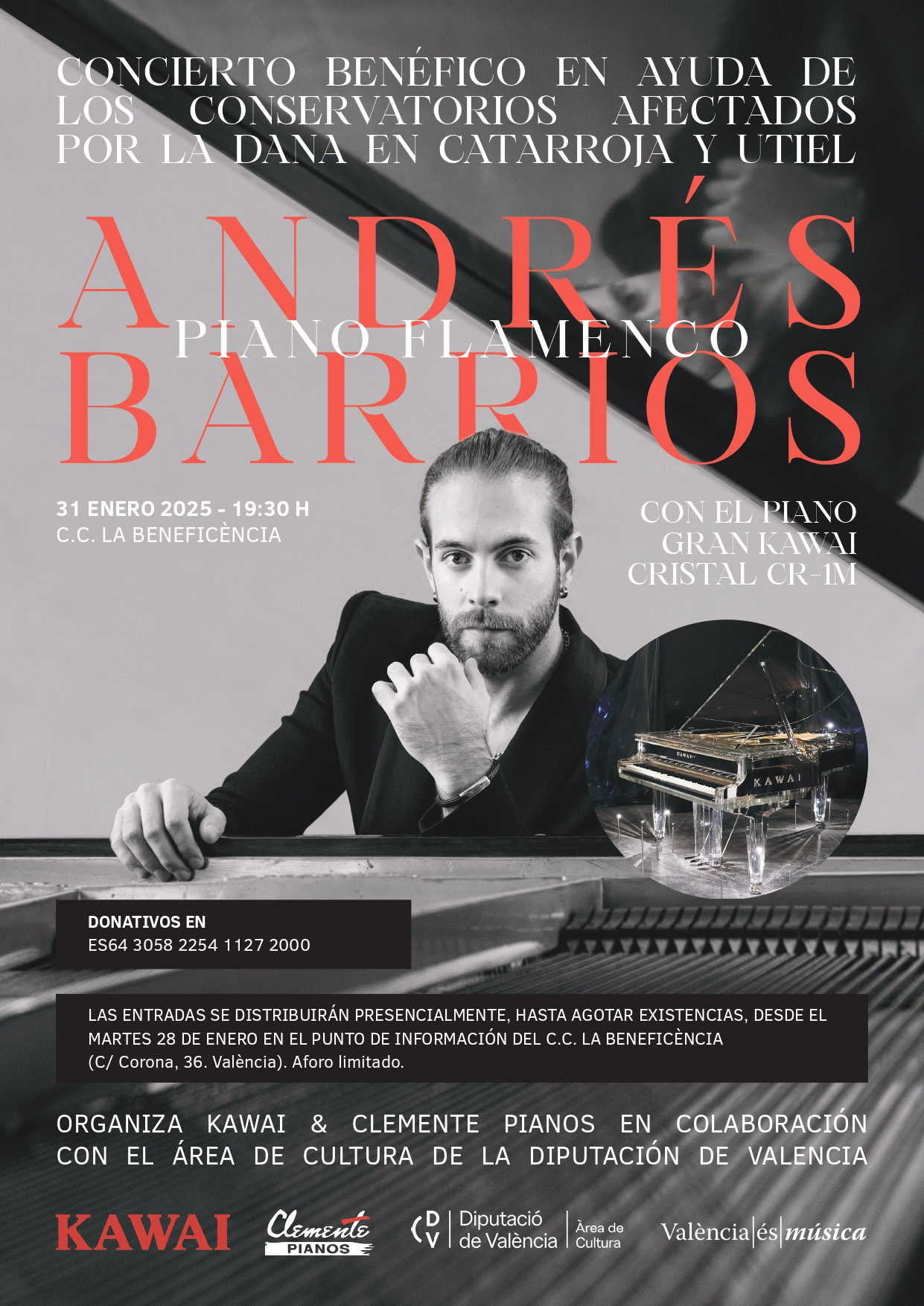 El concierto benéfico tiene lugar este viernes, a las 19:30 horas, en la Sala Alfons el Magnànim del Centre Cultural la Beneficència, propiedad de la Diputación, y las entradas pueden recogerse, hasta agotar existencias, en el vestíbulo principal de la Beneficència. Los asistentes disfrutarán del recital que correrá a cargo del pianista flamenco Andrés Barrios, a los mandos del piano Gran Kawai cristal CR-1M.