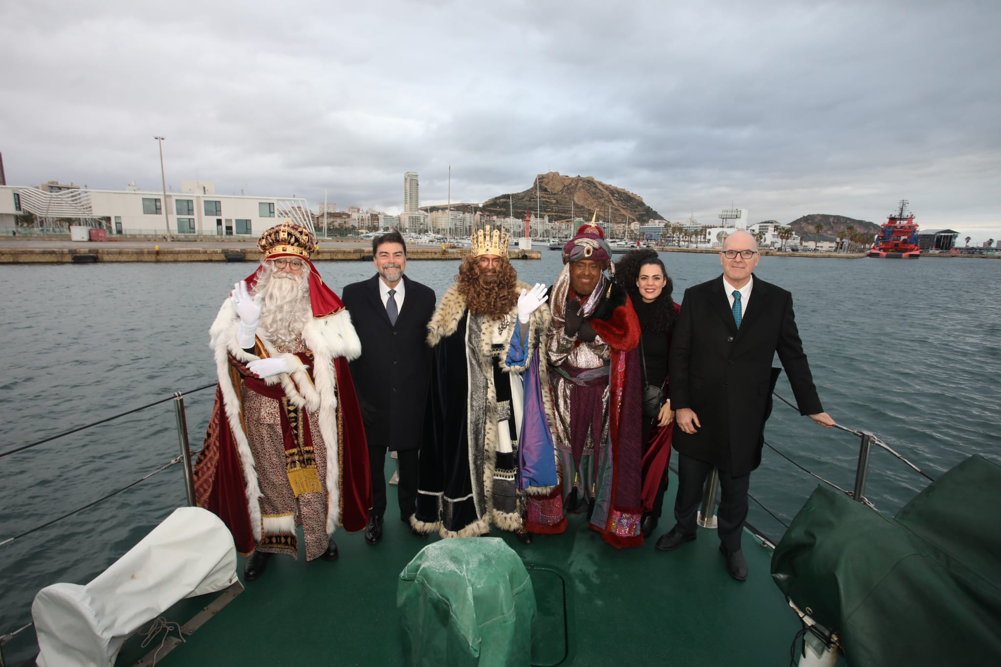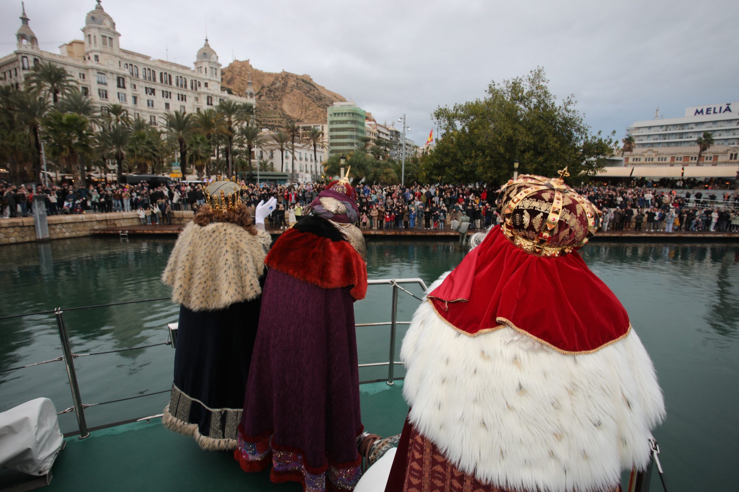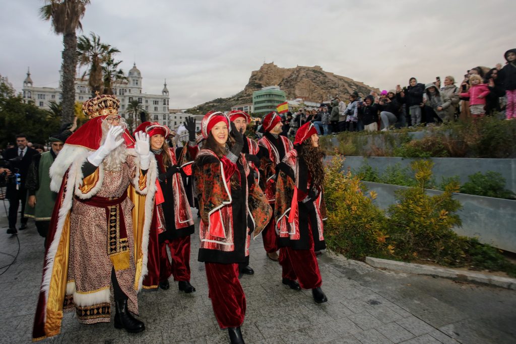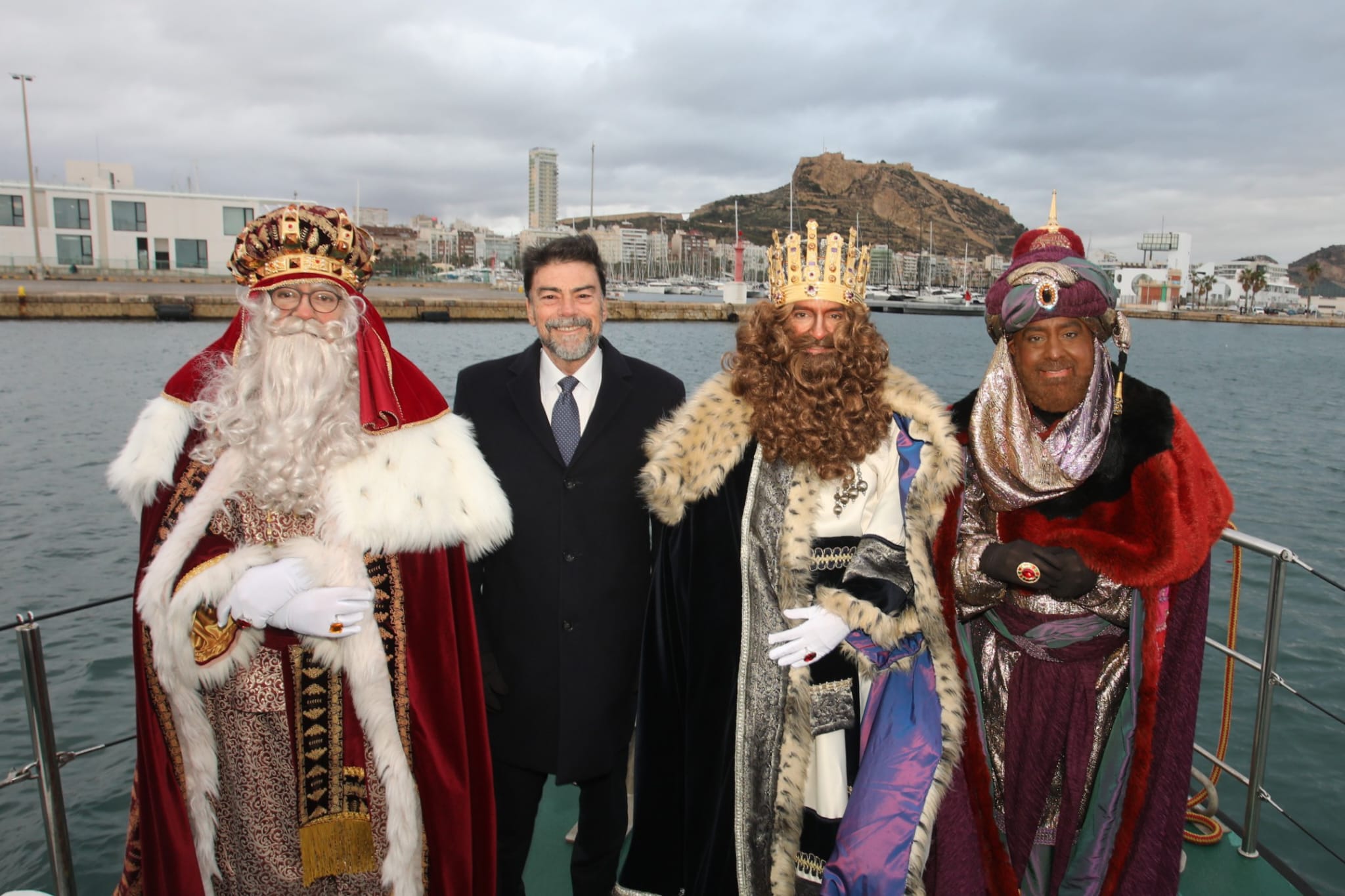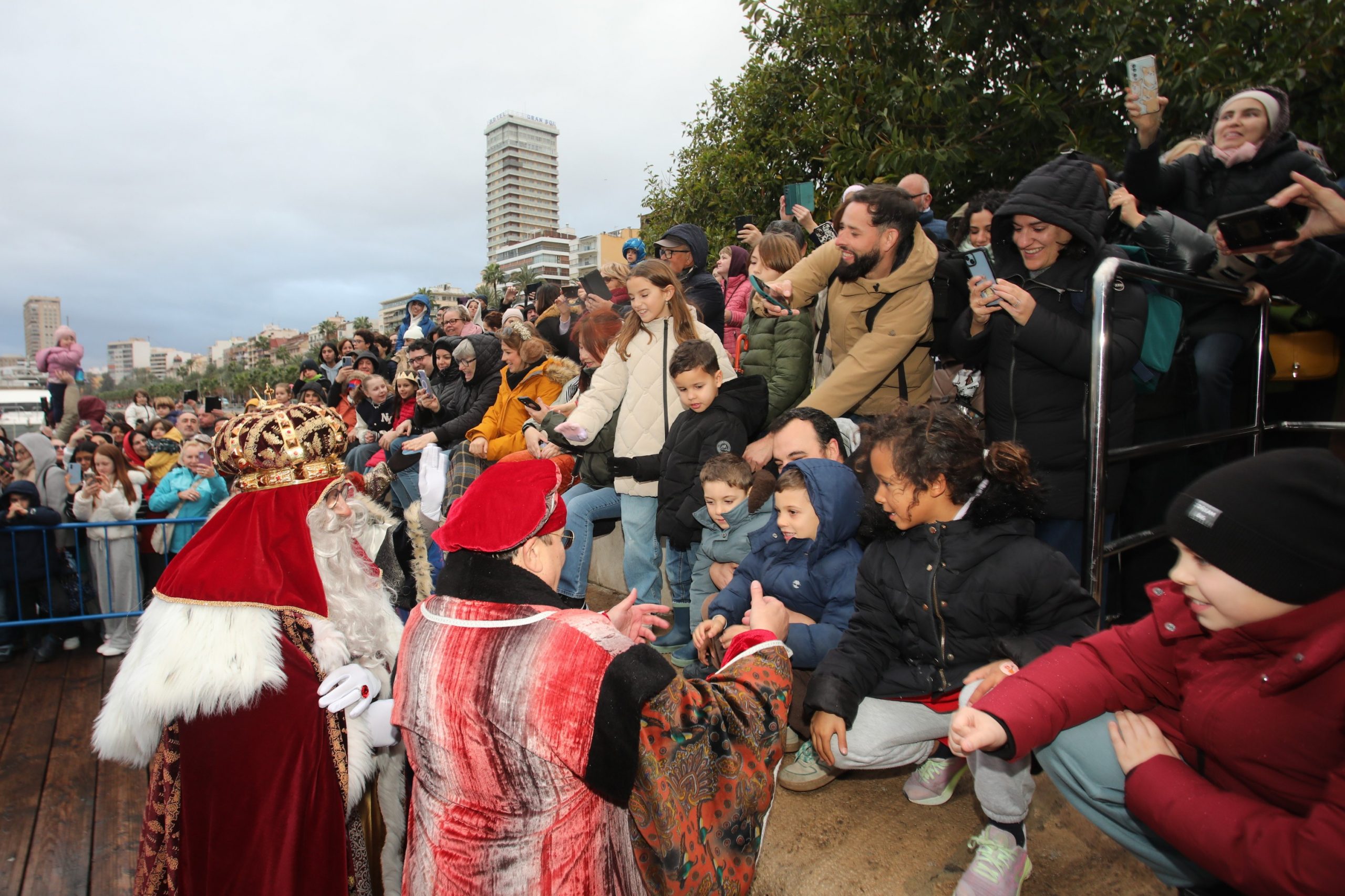 Las primeras muestras de afecto hacia Sus Majestades de Oriente -Antonio Beresaluce (Melchor), Carlos Bosch (Gaspar) y Nacho Amirola (Baltasar)- las han recibido al llegar a las Escaleritas de la Reina, en el puerto de Alicante, sobre las 17 horas. Allí han saludado a los pequeños congregados, en torno a un millar, que se han podido fotografiar con sus Majestades. Tampoco han faltado las cartas de última hora de los rezagados que no pudieron entregarlas este domingo en el pabellón Rafael Pastor a las Carteras Reales de Melchor (Luz Sigüenza), Gaspar (Elena Vidal) y Baltasar (Paloma Arroyo). Los Magos han sido recibidos por el alcalde Luis Barcala, el vicealcalde Manuel Villar, la concejala de Fiestas, Cristina Cutanda, e integrantes de la Corporación Municipal.