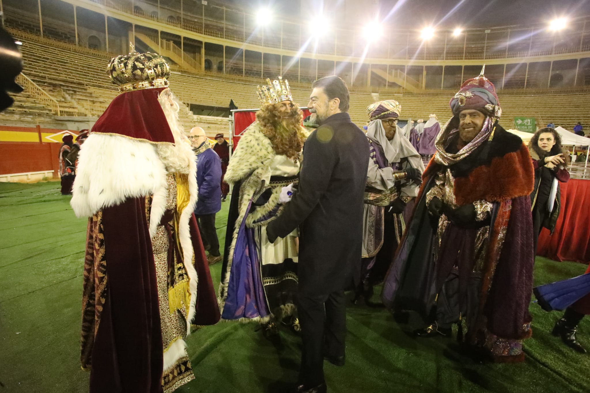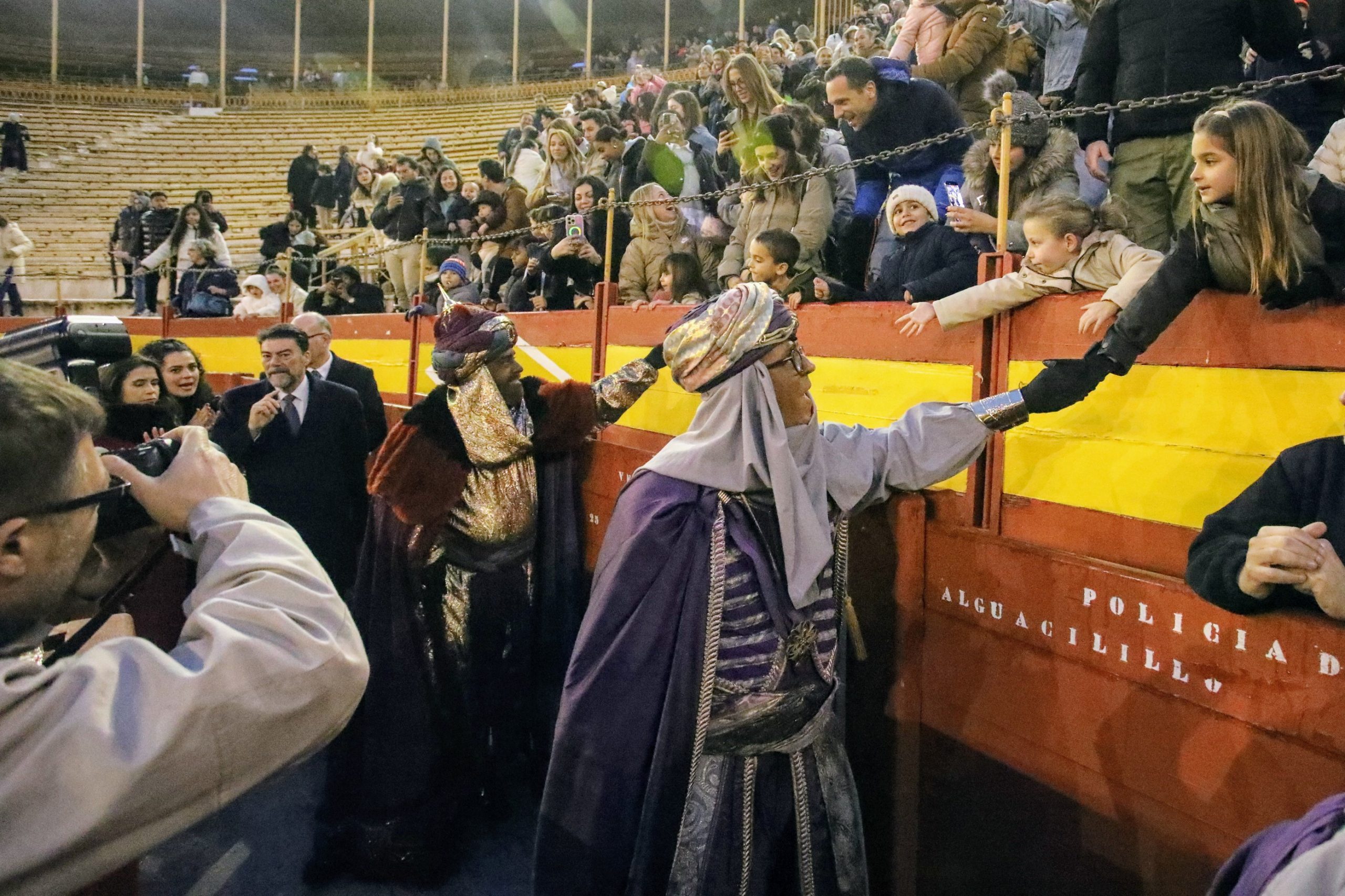 La Plaza de Toros ha sido el segundo punto en el que Melchor, Gaspar y Baltasar han comprobado cómo se vive en Alicante su visita anual. En el coso taurino han saludado y se han fotografiado con los niños y niñas de la ONCE (Organización Nacional de Ciegos Españoles), Cocemfe (Confederación Española de Personas con Discapacidad Física y Orgánica de Alicante) y de la Asociación de Ocio Ocupacional para Personas con Discapacidad Intelectual (AODI). Cerca de un millar de espectadores -la mayoría niños y niñas- los han recibido con una enorme ovación y un griterío de emoción, después de que finalizara un espectáculo infantil previo. Los aplausos continuados se han repetido después de que Sus Majestades accedieran al coso por el patio de sol y diera la vuelta al ruedo por el callejón hasta acceder al escenario, desde el que han saludado a los asistentes y les han deseado una feliz noche de la ilusión.