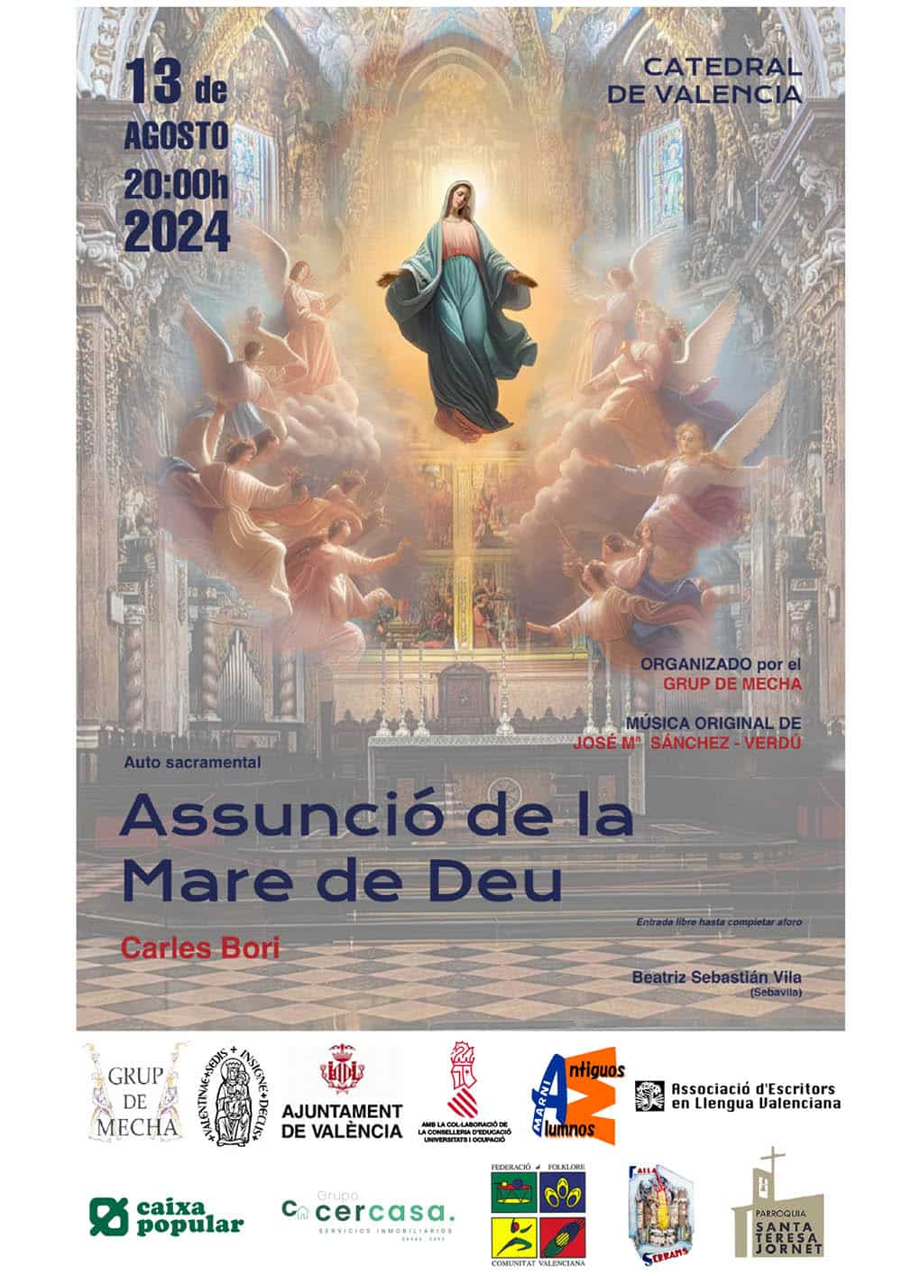 La Catedral de Valencia acogerá el próximo 13 de agosto la representación del “Misterio de la Asunción de la Mare de Déu”, un auto sacramental que no se escenificaba en la Seo desde hacía 400 años y que ahora ha sido recuperado, después de un proceso de trabajo y estudio de 5 años, a iniciativa del Grup de Mecha.