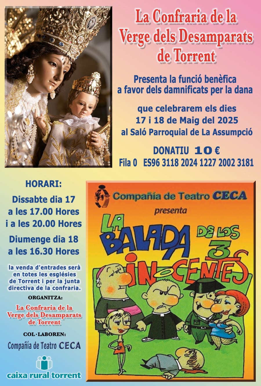 Con el objetivo de canalizar la ayuda ciudadana, la Cofradía ha preparado una propuesta cultural y solidaria que tendrá lugar los días 17 y 18 de mayo en el Salón Parroquial de la Asunción de Nuestra Señora. En esta ocasión, la compañía de teatro CECA representará la obra “La Balada de los 3 Inocentes”, una divertida comedia basada en el texto original de Pedro Mario Herrero, que promete arrancar sonrisas al tiempo que contribuye a una causa justa.