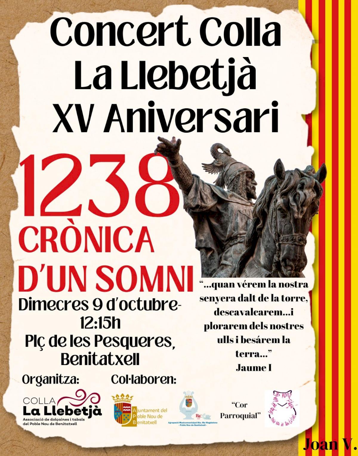A les 11:30h, la Banda del Poble Nou oferirà una cercavila i, a continuació, a les 12:15h, tindrà lloc a la plaça de les Pesqueres el gran concert de la Colla La Llebetjà per la celebració dels 15 anys com a agrupació. Interpretaran, junt amb la col·laboració del Cor Parroquial, el Grup de Danses Morro Falquí i els metalls de la Banda del Poble Nou l’espectacle ‘1238. Crònica d’un somni’, que relata la història del rei Jaume I.