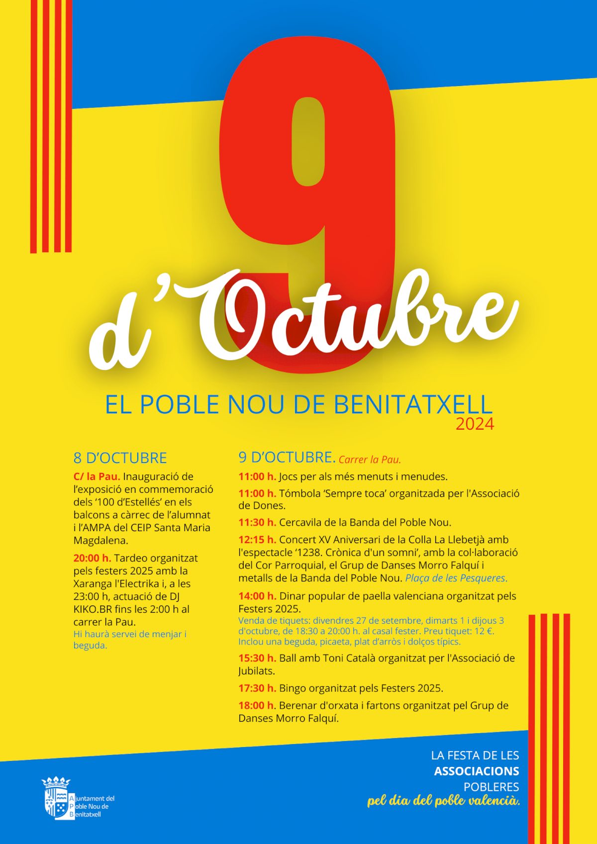 “El 9 d’Octubre és un dia especial per a totes les valencianes i valencians, i al Poble Nou el celebrem amb una jornada de germanor en la qual totes i tots eixim al carrer, i on les associacions del poble són les grans protagonistes. Tenim una de les festes més potents a nivell comarcal i tot és gràcies a l’enorme esforç de les agrupacions locals, que preparen amb molta estima este dia. Elles són el motor que des de fa més d’una dècada ajuda a que esta festa siga un èxit”, ha assenyalat el regidor de Cultura, Jorge Pascual.