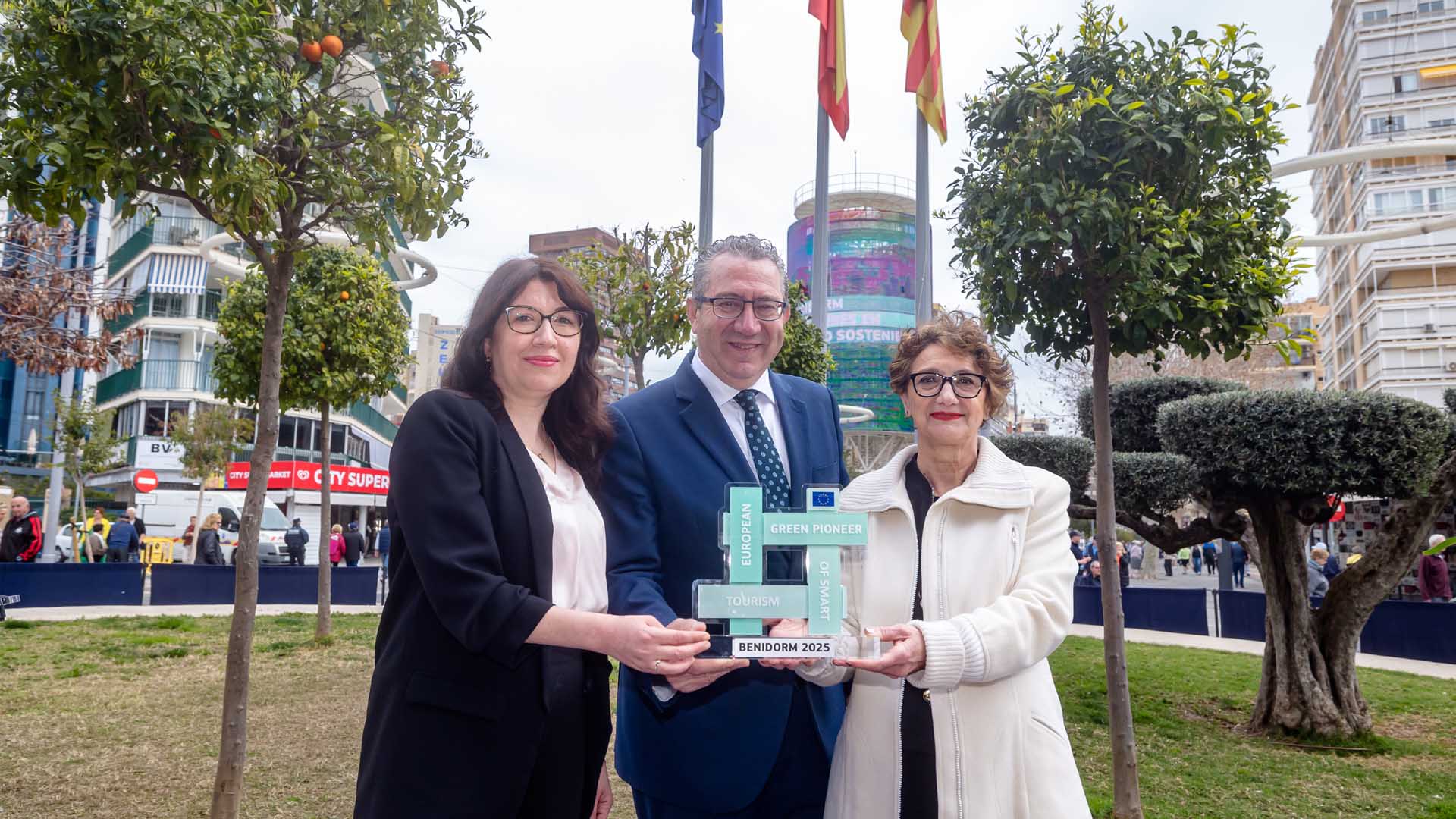La concesión de este distintivo y la colocación de la escultura conmemorativa, que lucirá durante todo el año casi a los pies del tecnohito, es el primero de los actos que se van a desarrollar a lo largo de todo este 2025 para difundir a nivel europeo los hitos y buenas prácticas que han valido a Benidorm para obtener este reconocimiento como Pionero Verde del Turismo Inteligente.