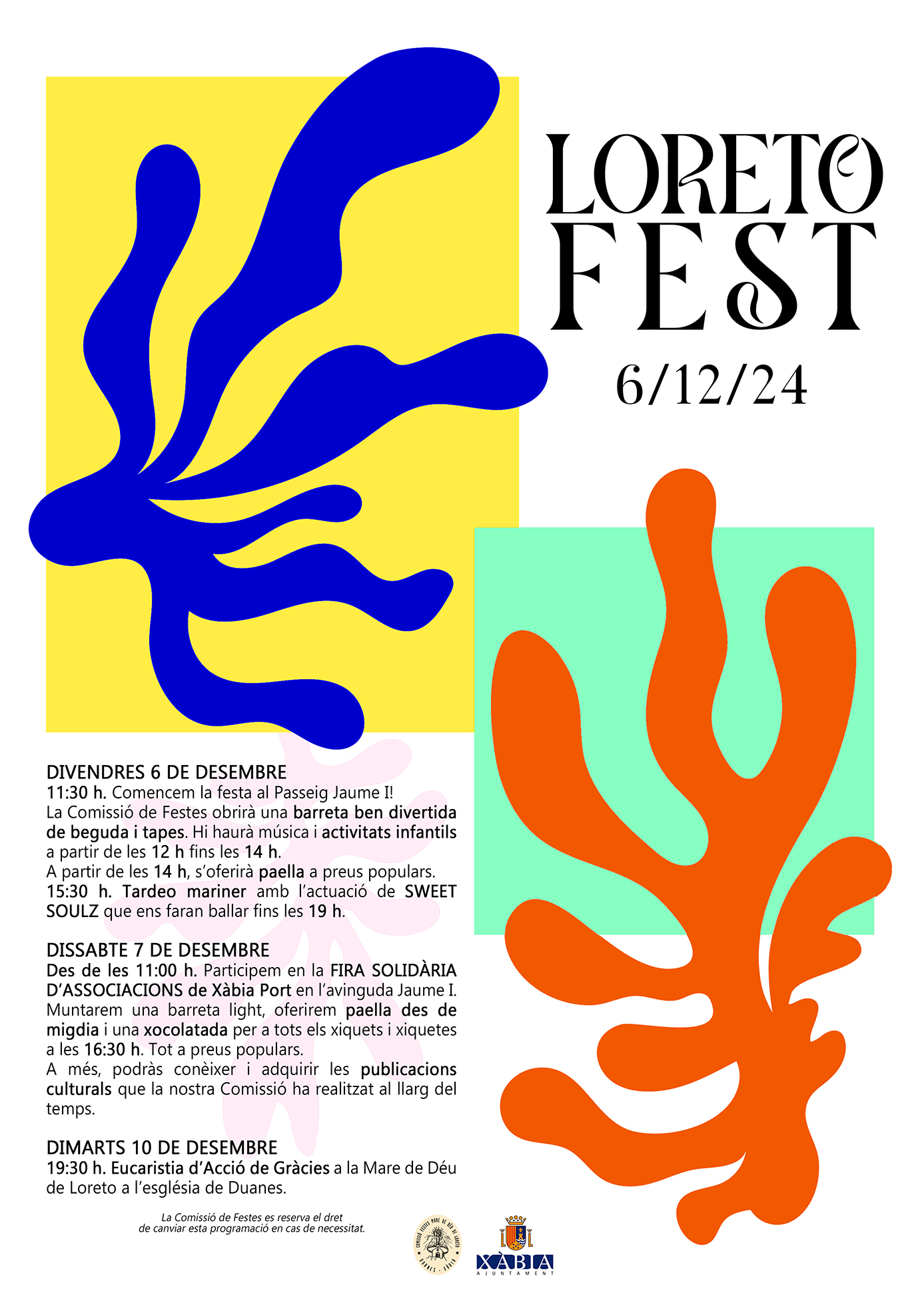 En torno a la celebración oficial de la Virgen de Loreto del 10 diciembre, la Comissió de Festes vuelve a apostar, por segundo año consecutivo, por el LoretoFest; una iniciativa lúdica y festiva que tiene como objetivo dinamizar Duanes de la Mar y recaudar fondos para la consecución de las actividades que lleva a cabo a lo largo del año y las fiestas patronales de 2025.